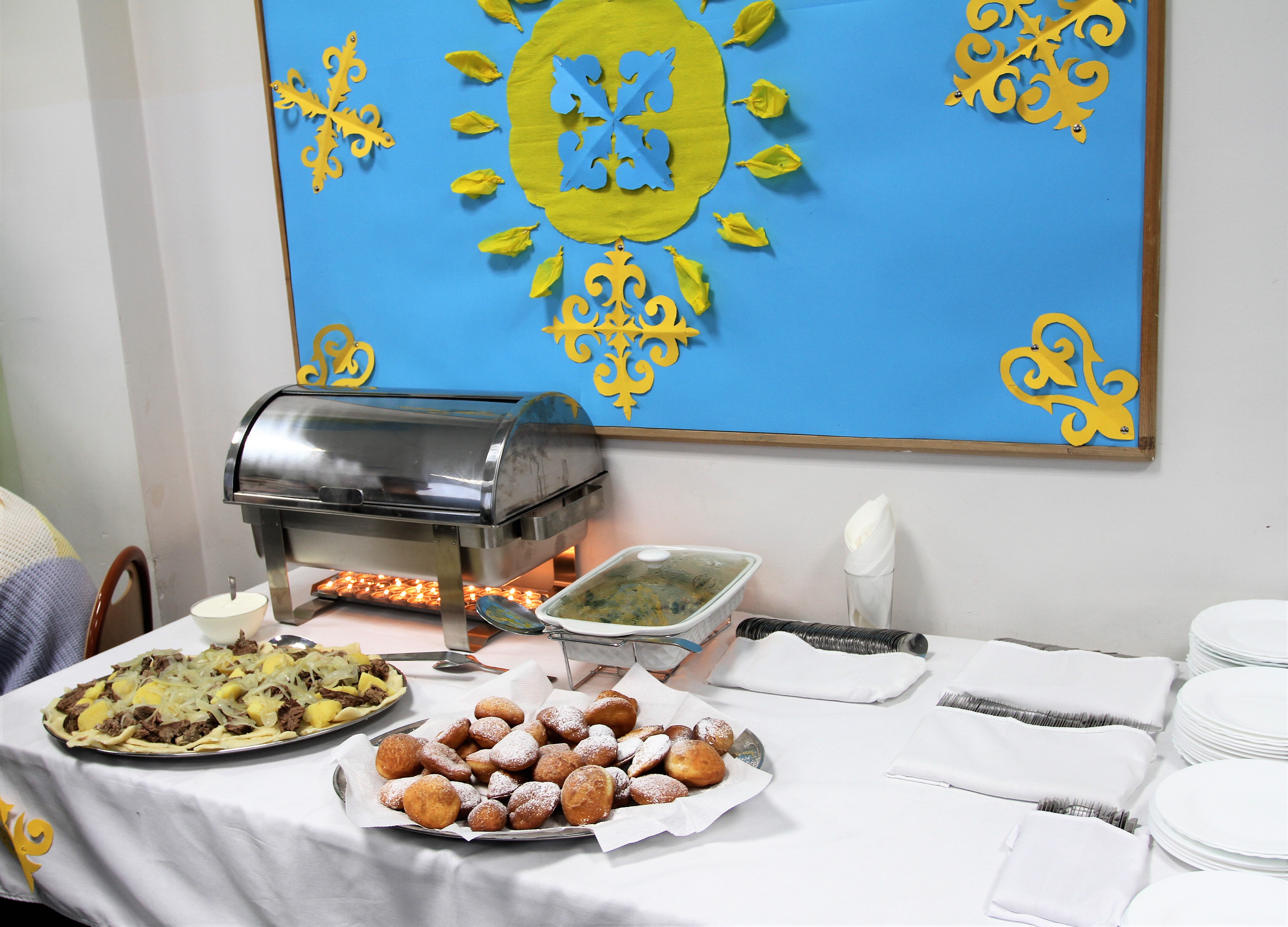 Po prawdziwej uczcie duchowej przyszła pora na „coś” dla podniebienia. Wśród degustowanych smakołyków kuchni kazachskiej znalazły się m. in. manty, czyli tradycyjne pierożki, danie pod nazwą plow, „pięć palców” i bursaki przypominające nasze racuszki. Na zakończenie dyrektor szkoły Katarzyna Kołodziejska pogratulowała pomysłu Dnia Kultury Kazachstanu, ale i talentu młodzieży, wyrażając radość, że możemy cieszyć się wolnością, czuć się bezpiecznie i żyć w kraju, gdzie można poznawać inne narody współczesnego świata. Pani Dyrektor podziękowała też za przybycie na to wydarzenie grupie studentek z Kazachstanu, aktualnie uczących się w Akademii Finansów i Biznesu „Vistula” w Warszawie. Wszyscy, w geście solidarności z uczniami szkoły, którzy pochodzą z Ukrainy, minutą ciszy uczcili pamięć ofiar konfliktu rosyjsko-ukraińskiego.