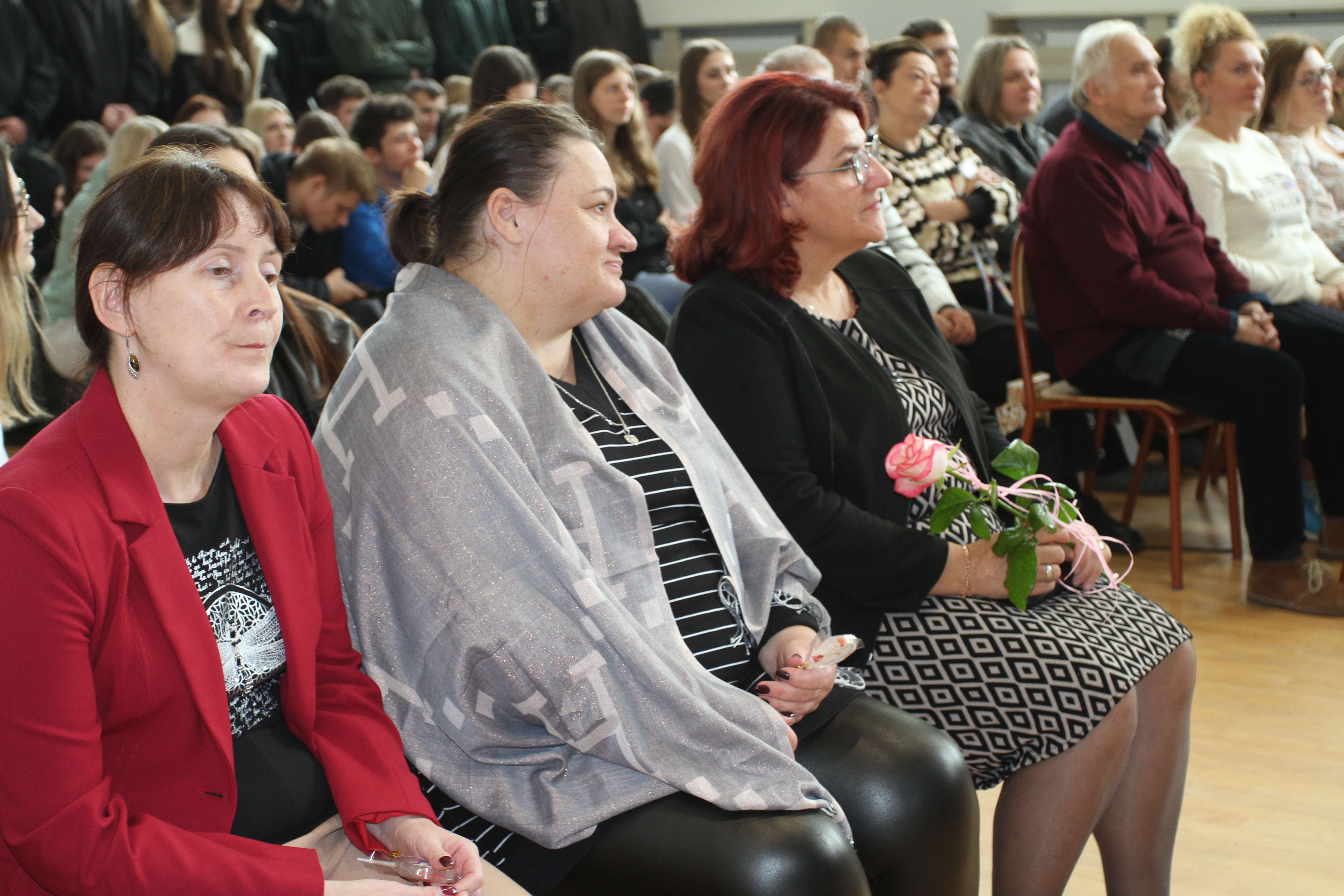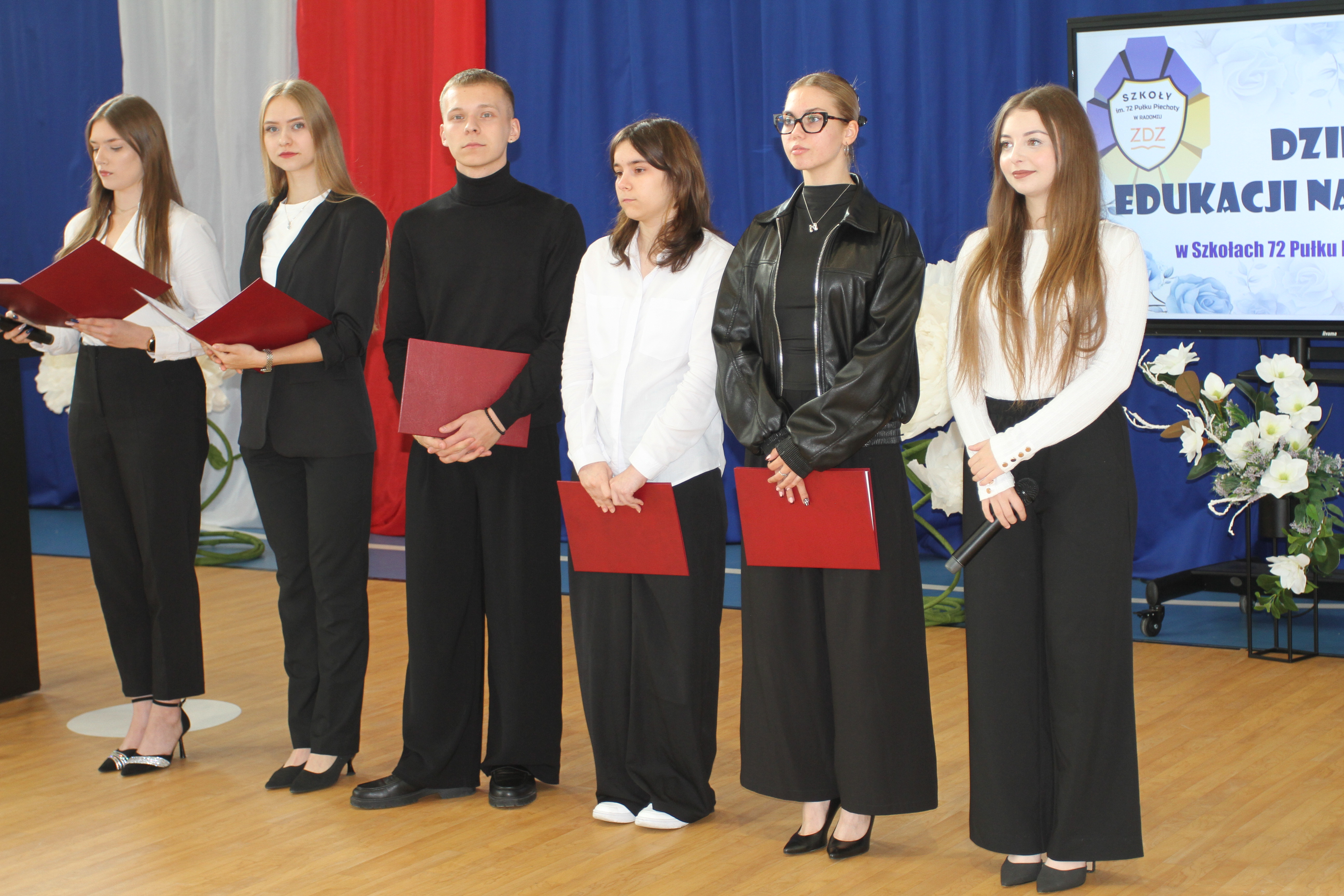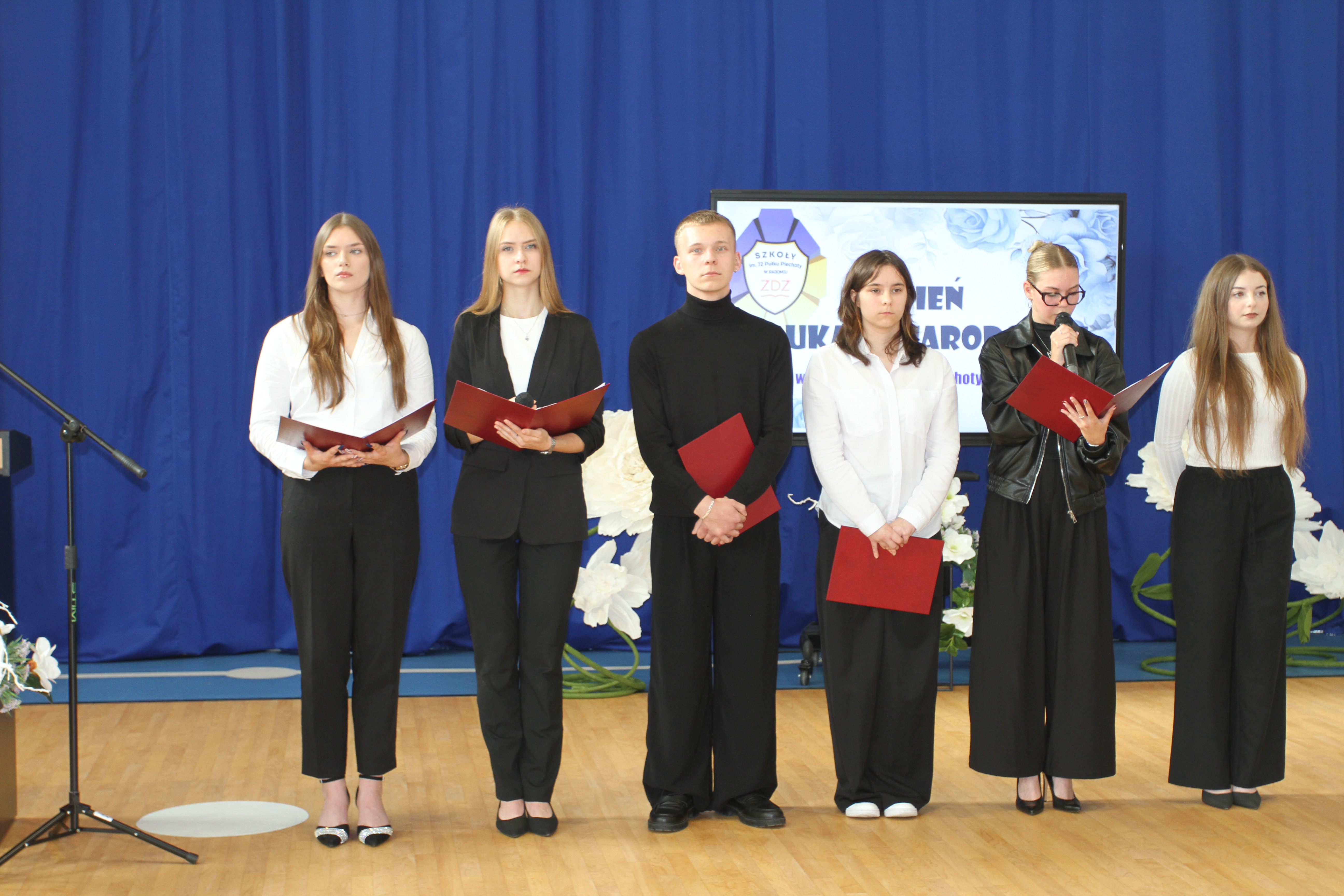 15 października 2025 r. w odświętnej oprawie odbyło się spotkanie naszej społeczności szkolnej. Okazje były dwie: Dzień Edukacji Narodowej i Dzień Pracownika Zakładu Doskonalenia Zawodowego. Obydwa święta są zawsze obchodzone 14 października. W programie nie mogło więc zabraknąć akademii z przypomnieniem najważniejszych kart historii i na tym tle poetycko-muzycznej prezentacji uczniów. Młodzież z uśmiechem i wdzięcznością podziękowała za trud, serce i cierpliwość, a przede wszystkim przekazywaną codziennie wiedzę i troskę o komfort nauki i rozwój szkoły. Życzenia w imieniu uczniów przekazał Patryk Kowalczyk, przewodniczący samorządu szkolnego. Kadrze pedagogicznej, a także pracownikom administracyjnym złożyła życzenia i podziękowania wicedyrektor Alicja Lament. – To taki jedyny dzień w roku – powiedziała, gdy w poczuciu dumy cieszymy się z dużych i małych sukcesów w pracy pedagogicznej. Życzmy sobie, aby było ich jak najwięcej i zawsze bądźmy razem. Na zakończenie odczytany został list gratulacyjny dla całej społeczności szkolnej od Dariusza Wątroby, wiceprezesa Zakładu Doskonalenia Zawodowego w Kielcach.