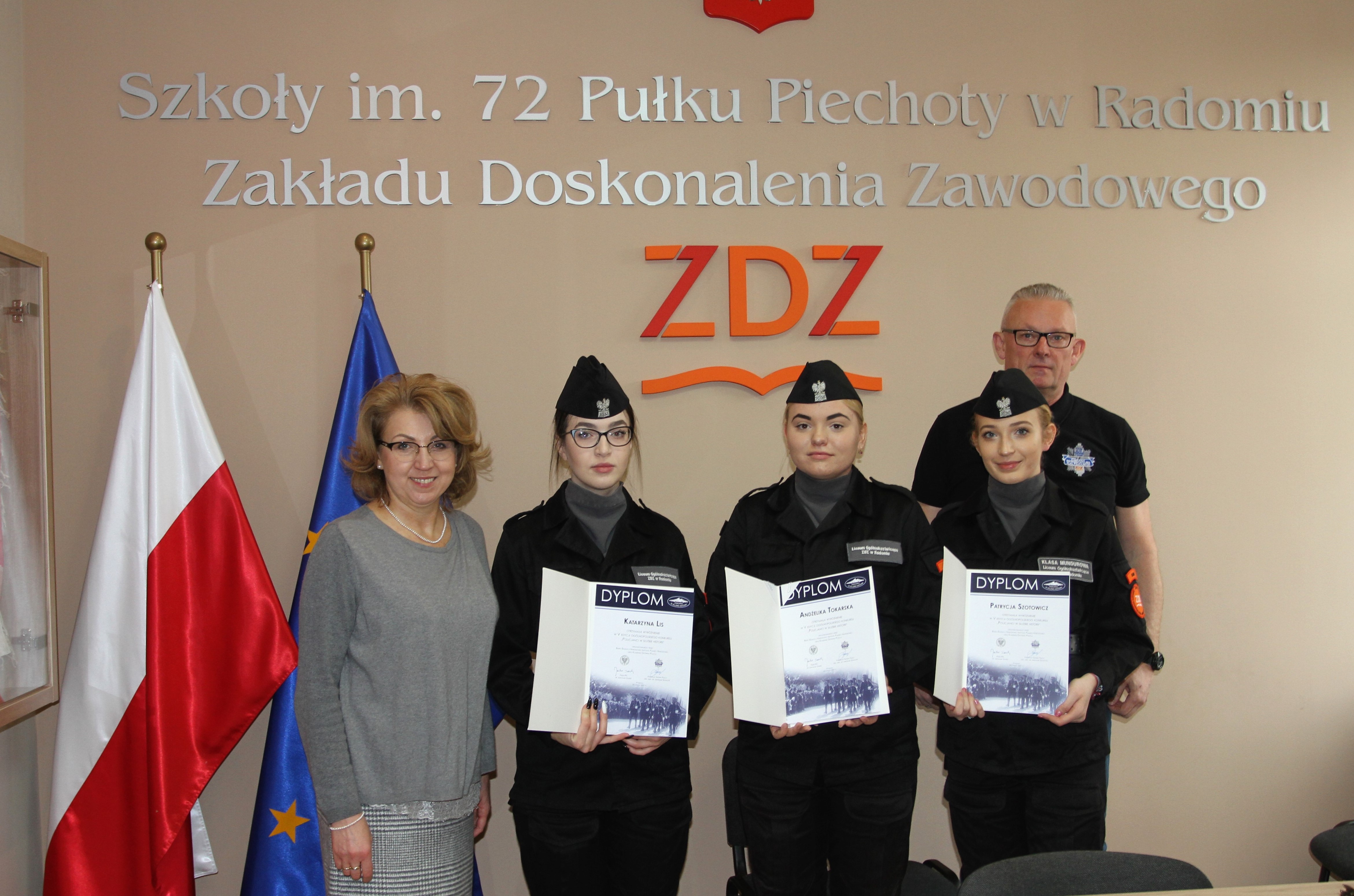 Szkoły im. 72 Pułku Piechoty przystąpiły do V edycji Ogólnopolskiego Konkursu „Policjanci w służbie historii”, zorganizowanego przez Biuro Edukacji Narodowej IPN oraz Komendę Główną Policji. 16 marca 2022 r. w szkolnej Sali Tradycji odbyło się spotkanie dyrektor Katarzyny Kołodziejskiej z nauczycielami realizującymi edukację policyjną w szkole oraz uczestnikami konkursu. Troje z nich: Andżelika Tokarska, Patryk Szotowicz i Katarzyna Lis zdobyło wyróżnienia. Spotkanie było okazją, by wyżej wymienionym uczniom wręczyć dyplomy, a także złożyć w pełni zasłużone gratulacje. Nagrody w prestiżowym, ogólnopolskim konkursie są sukcesem, poprzedzonym wielotygodniową nauką. Tym bardziej dziękuję młodzieży za wysiłek, a nauczycielom – za zaangażowanie i inicjatywę – podsumowała Pani Dyrektor.
