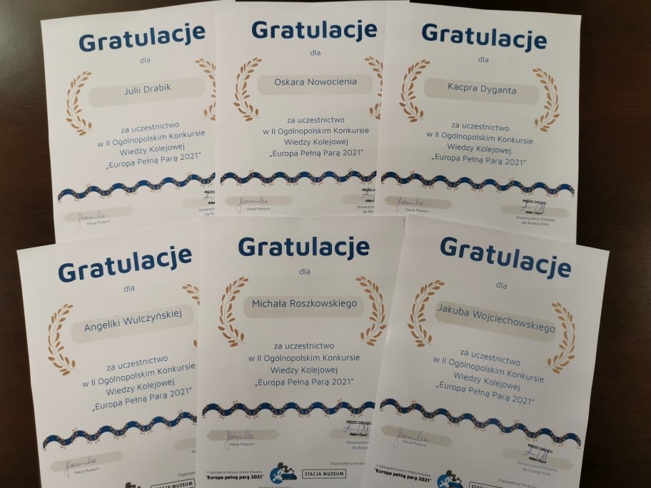Uczniowie klas 2TD, 3TD, 3TG, 4TB kształcący się w zawodzie Technik transportu kolejowego, 22 kwietnia 2021 r. wzięli udział w II OGÓLNOPOLSKIM KONKURSIE WIEDZY KOLEJOWEJ pn. „Europa Pełną Parą 2021” organizowanym przez przez Stowarzyszenie Edukacja dla Rozwoju Kolei i Stację Muzeum w Warszawie.