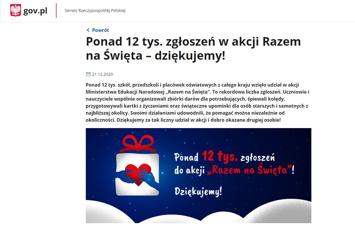Podziękowania dla uczniów Szkół im. 72 Pułku Piechoty w Radomiu przekazał Minister Edukacji i Nauki Przemysław Czarnek za udział w akcji "Razem na święta".