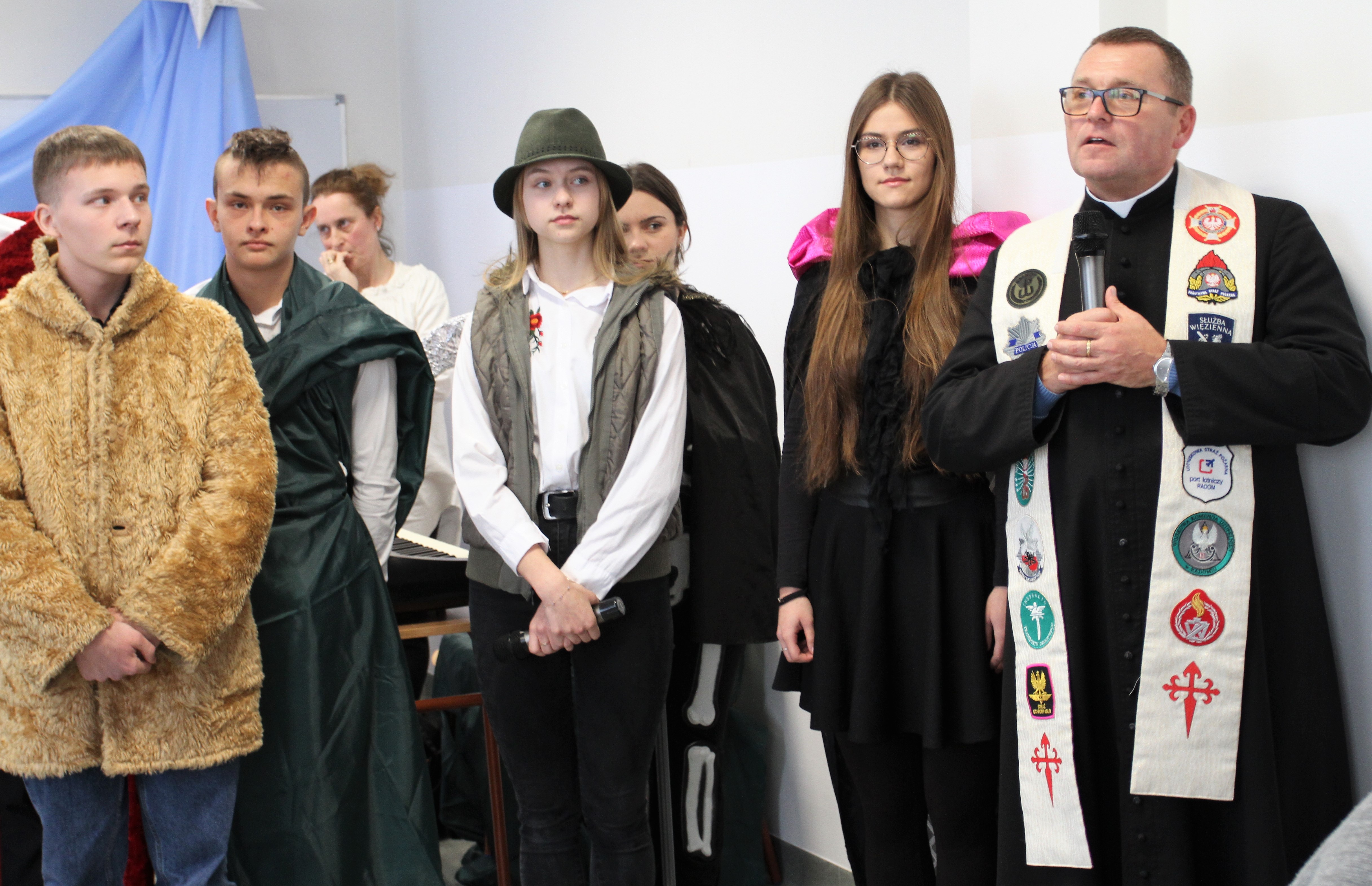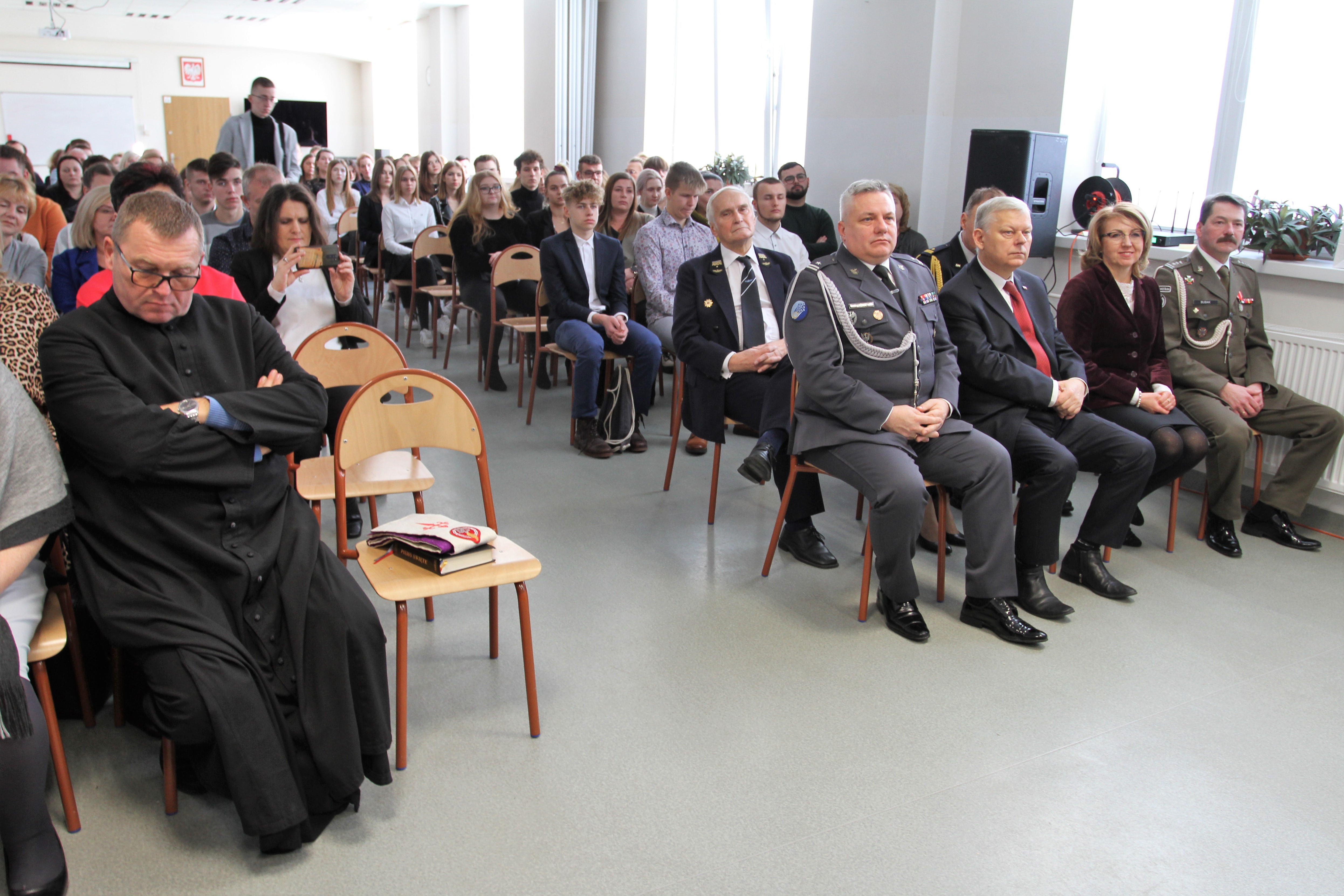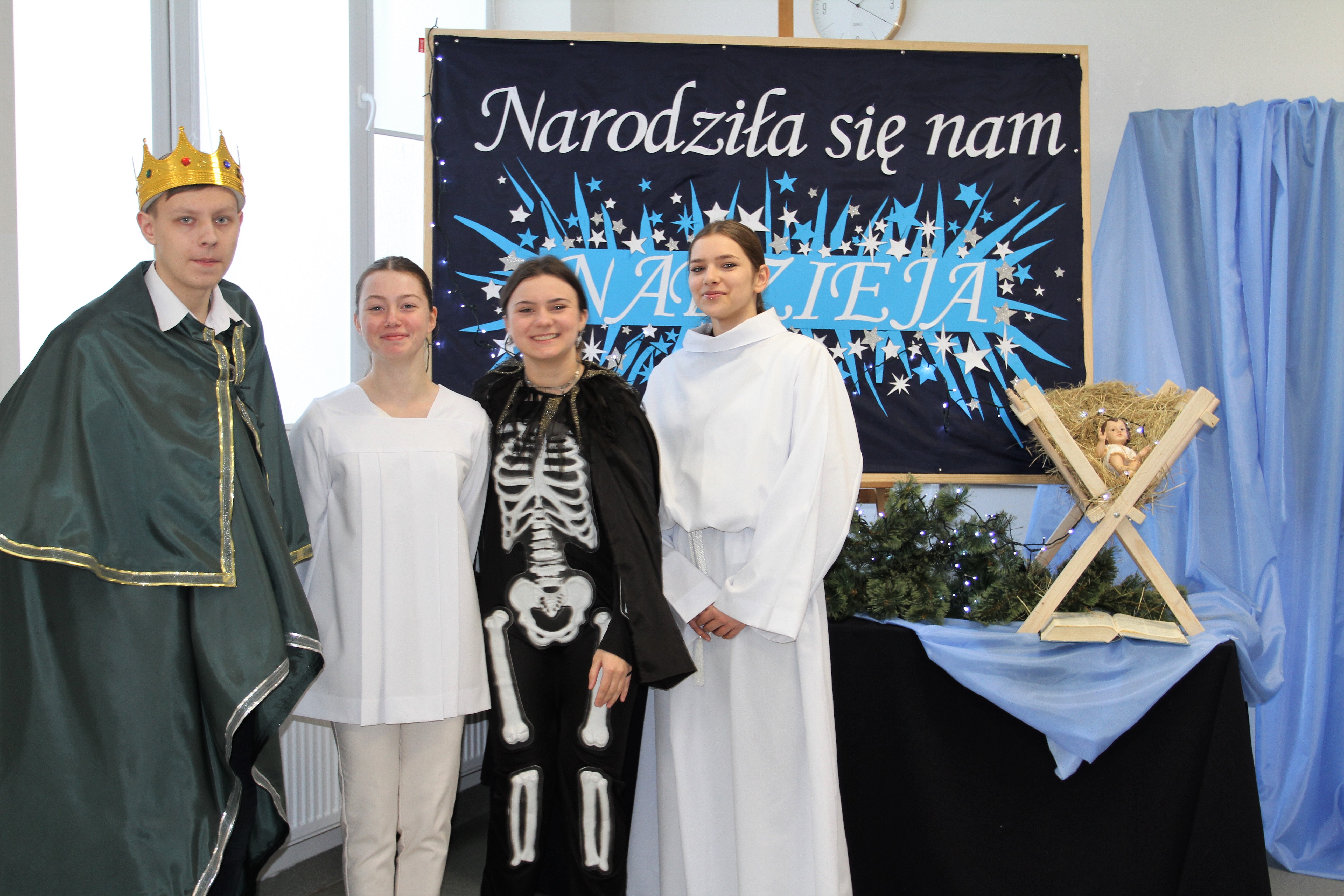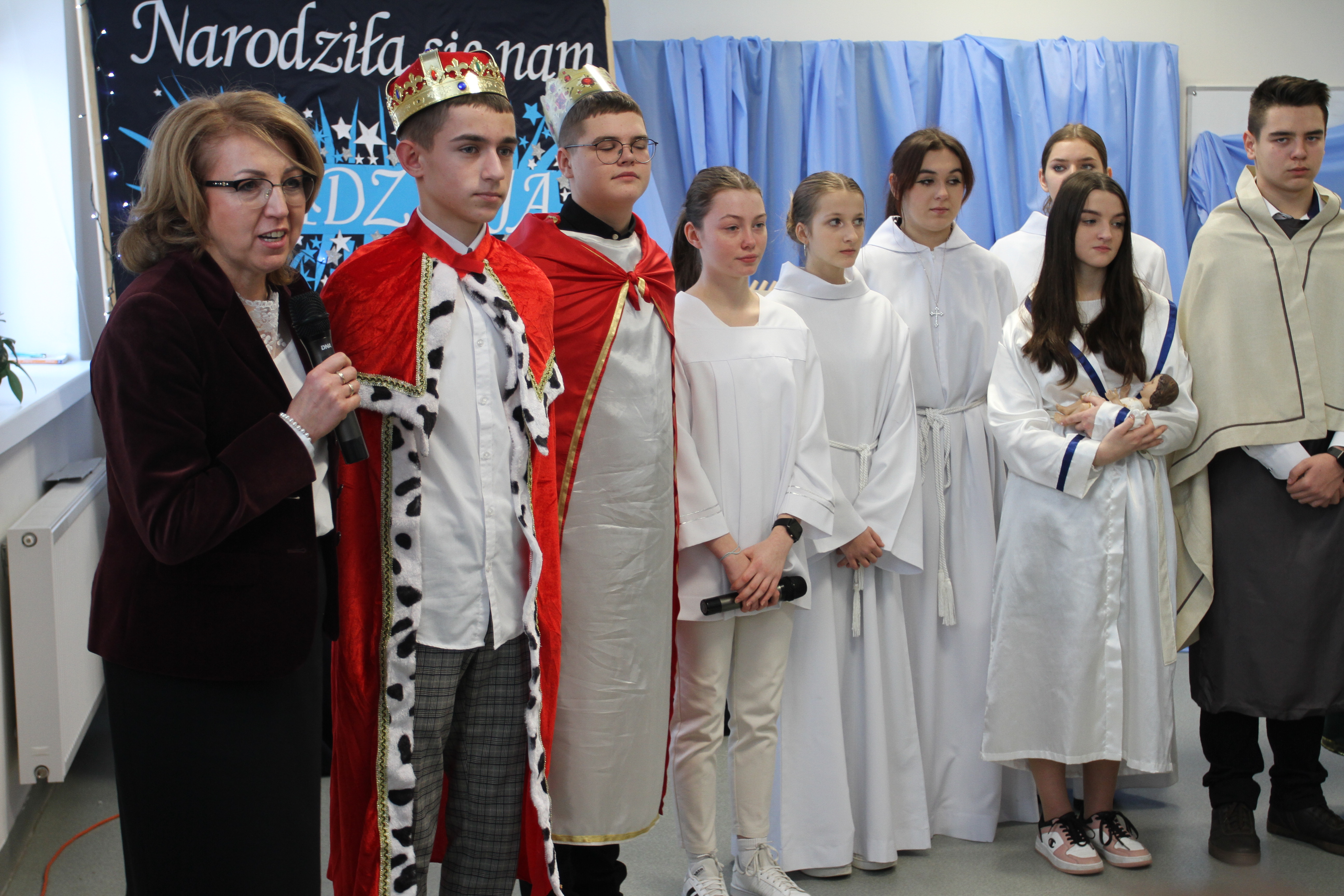 „Narodziła się nam Nadzieja” – pod takim tytułem uczniowie pod kierunkiem pani katechetki, Katarzyny Pyzary, przygotowali jasełka, na które zaprosili całą społeczność szkół i działalności kursowej w dniu 19 grudnia 2022 r. W takiej scenerii do dyrekcji, grona pedagogicznego i pracowników, a także młodzieży szkolnej zwrócili się z życzeniami świąteczno-noworocznymi Goście uroczystości: poseł Marek Suski oraz ks. Gabriel Marciniak – duszpasterz służb mundurowych. Zaproszenie do udziału w jasełkach przyjęli również przedstawiciele służb mundurowych, pracodawcy z branży lotniskowej i kolejowej. W programie uroczystości nie mogło zabraknąć podzielenia się opłatkiem, a następnie poczęstunku tradycyjnymi potrawami wigilijnymi. Dziękując Gościom za obecność, a młodzieży i nauczycielom za inicjatywę i zorganizowanie wspaniałego przedświątecznego spotkania dyrektor Katarzyna Kołodziejska życzyła wszystkim na ten wyjątkowy czas zdrowia, spokoju i mnóstwo rodzinnego ciepła oraz wszelkiej pomyślności i spełnienia zamierzeń w Nowym Roku.