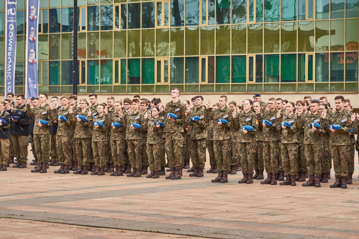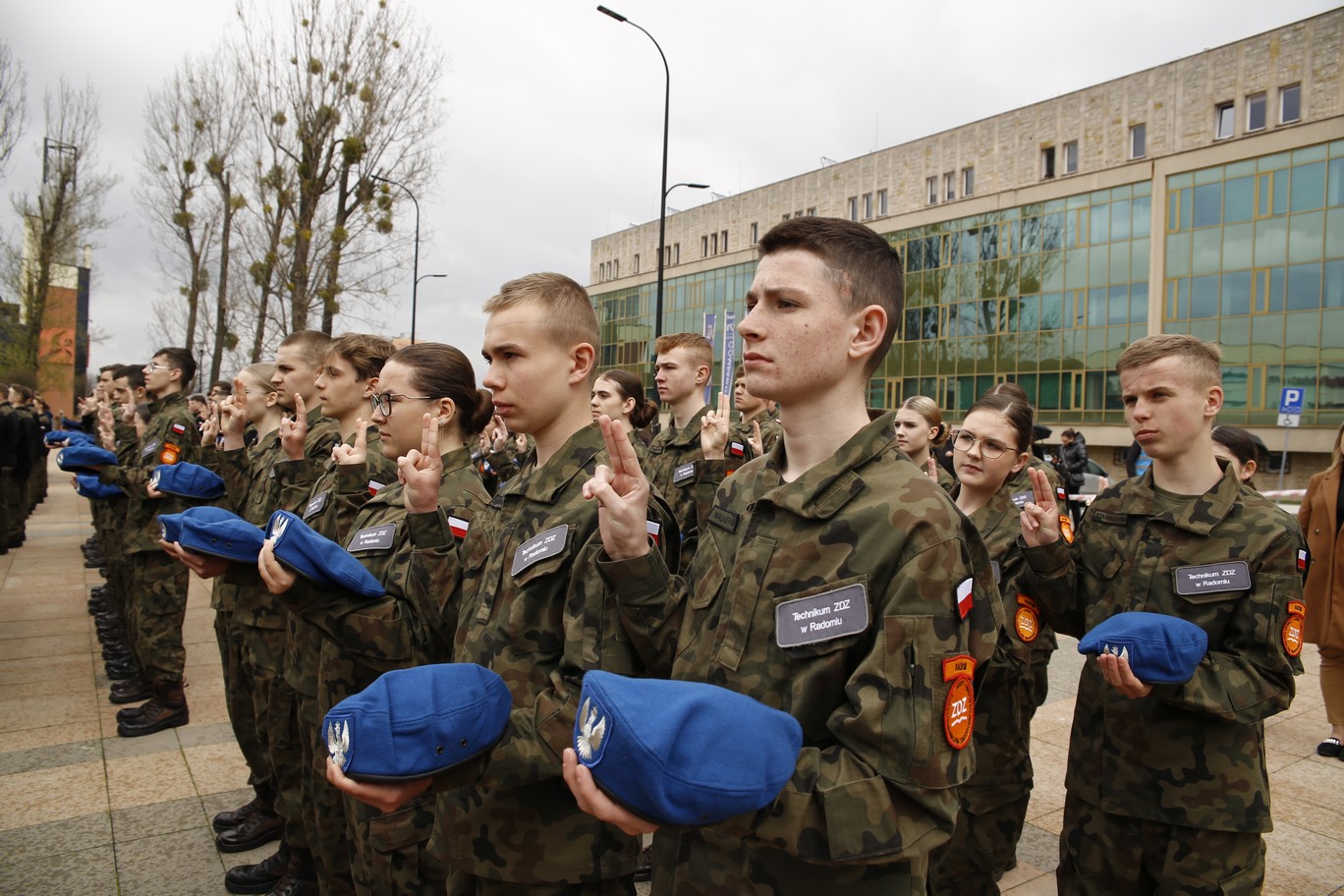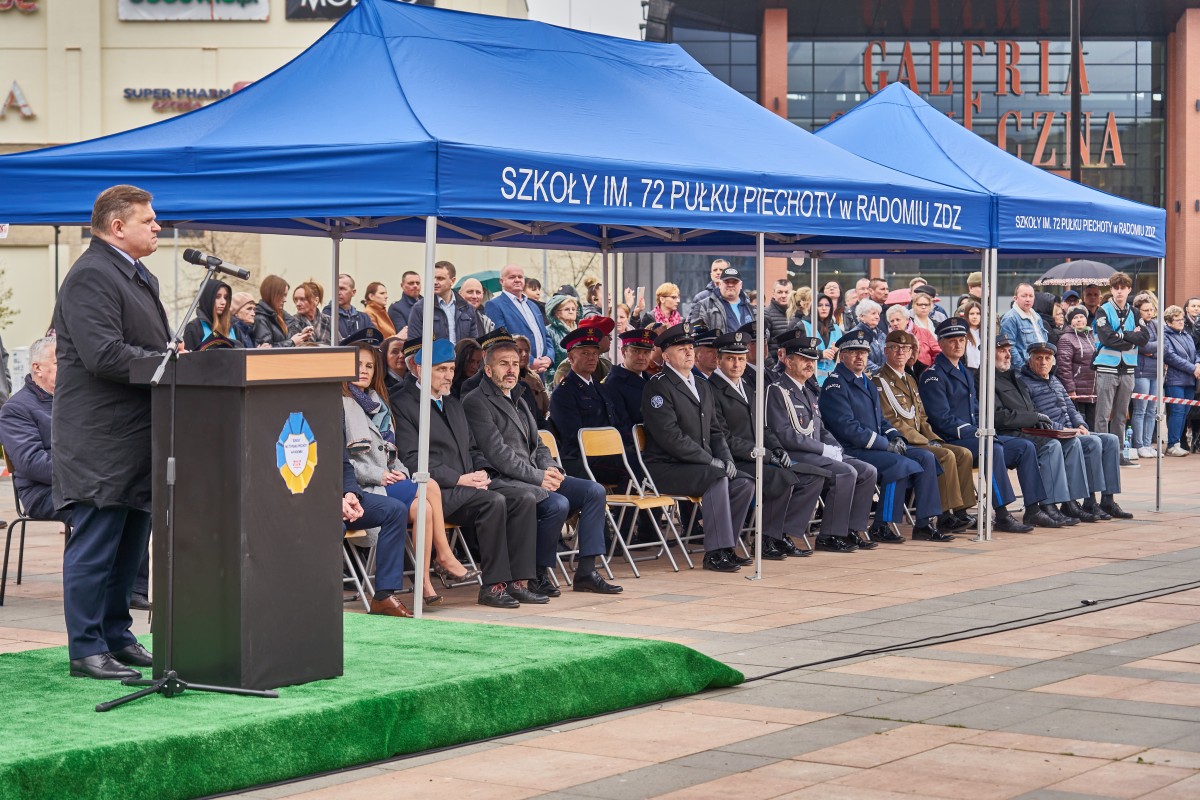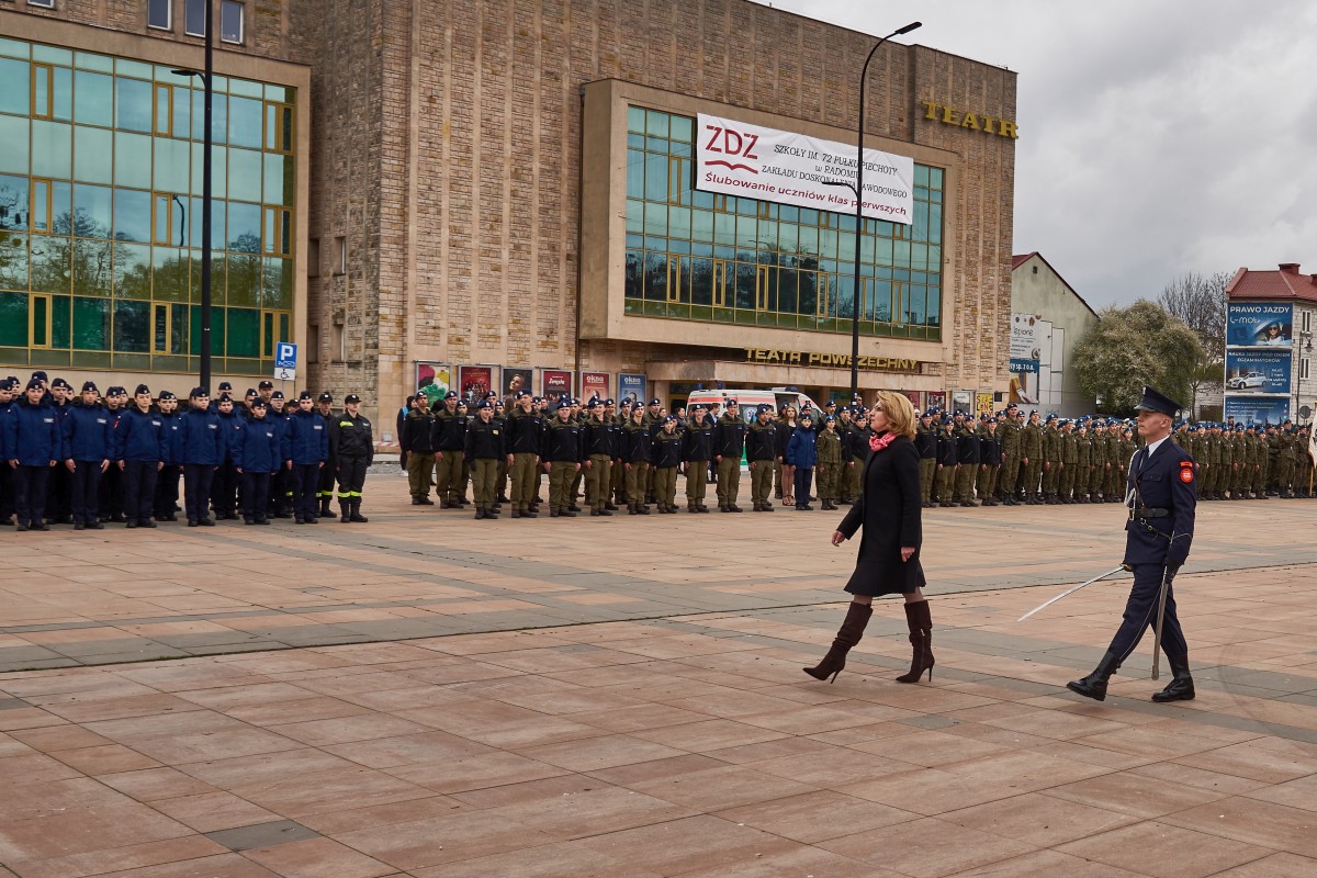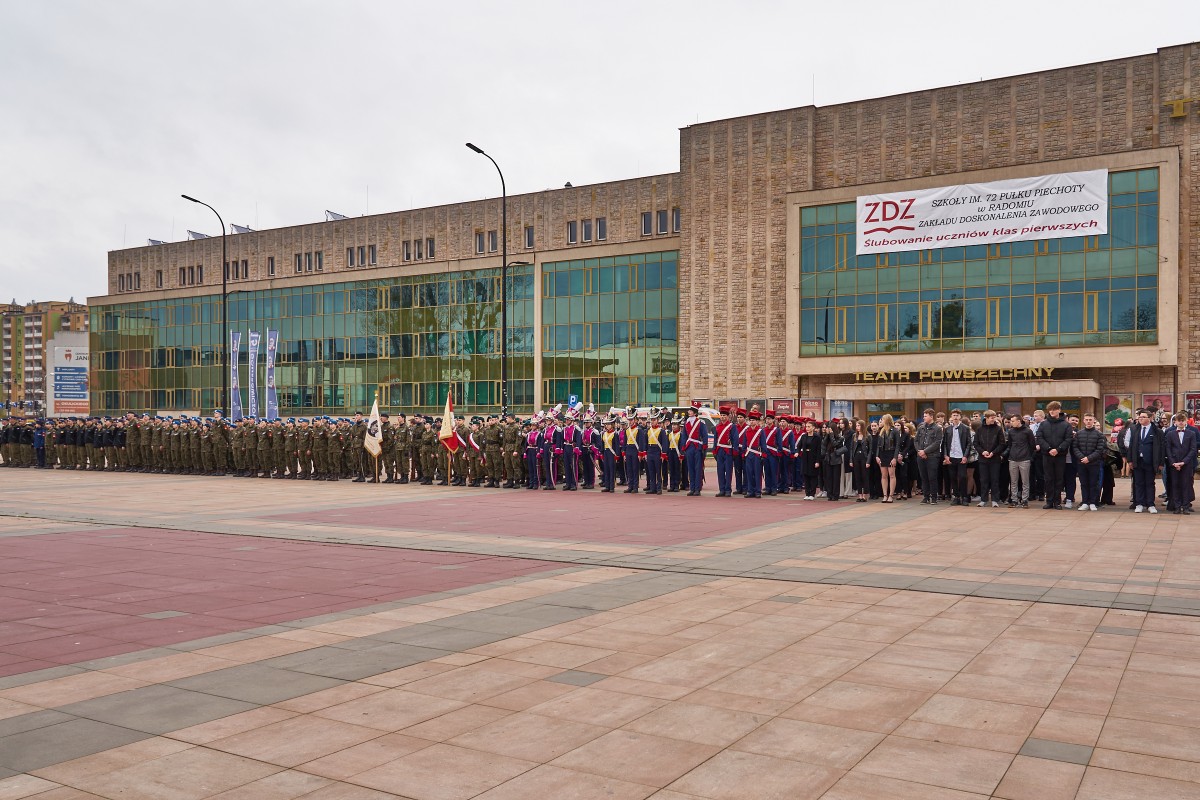 200 uczniów klas pierwszych Szkół im. 72 Pułku Piechoty w Radomiu Zakładu Doskonalenia Zawodowego złożyło ślubowanie zgodne z wojskowym ceremoniałem. Główna uroczystość odbyła się 19 kwietnia 2023 r. na Placu. Jagiellońskim. Ceremoniał poprzedziła msza święta w Kościele Garnizonowym, sprawowana w intencji społeczności szkolnej. Wśród gości uroczystości byli przedstawiciele władz państwowych, oświatowych oraz samorządowych, także służby mundurowe, partnerzy szkoły w realizacji edukacji wojskowej, policyjnej i strażackiej. - To już 14 rok, kiedy kultywujemy tradycję ślubowania uczniów klas pierwszych. Ta uroczystość z każdym rokiem coraz bardziej zachwyca. Jestem dumna, że tylu młodych ludzi pragnie zdobywać nowe kwalifikacji, jednocześnie rozwijając w sobie etos patriotyzmu i poświęcenia dla ojczyzny. Obecność klas mundurowych w naszej szkole nie jest przypadkowa. Placówka nosi imię 72 pułku piechoty, tak blisko związanego z historią Radomia - mówiła dyrektor Katarzyna Kołodziejska. Wyboru szkoły pogratulował uczniom Wojciech Skurkiewicz, wiceminister obrony narodowej, życząc tego, aby w przyszłości zostali żołnierzami Wojska Polskiego. Jak podkreśliła Katarzyna Kalinowska, zastępca prezydenta Radomia, Szkoły ZDZ z blisko 30 kierunkami kształcenia są ważnym punktem na edukacyjnej mapie Radomia. - Życzę składającym ślubowanie uczniom, by po zakończeniu edukacji mieli ogromną satysfakcję i poczucie dobrze podjętej decyzji – powiedziała wiceprezydent. Młodzieży udzielił błogosławieństwa ks. mjr Łukasz Józef Hubacz, proboszcz Kościoła Garnizonowego. Za wyjątkowo wzruszającą uroczystość podziękowali dyrekcji i gronu pedagogicznemu szkoły rodzice. Uczniowie zaś nie kryli radości, zgodnie stwierdzając, że ten dzień zapamiętają na długo. Od pierwszych dni nauki w szkole czują się pełnoprawnymi członkami społeczności szkolnej. Teraz pełnym sercem będą realizować słowa wypowiedzianej przysięgi. Ślubowanie było też okazją, aby wyróżnić listami gratulacyjnymi pierwszoklasistów, którzy zaangażowali się w przygotowanie uroczystości. Jak co roku, uczestnicy i obserwatorzy tej uroczystości nagrodzili gromkimi brawami pokazy umiejętności uczniów klas fryzjerskich oraz naszej kompanii reprezentacyjnej. Blisko dwugodzinny ceremoniał zakończyła efektowna defilada kompanii reprezentacyjnych zaprzyjaźnionych szkół m.in. z Kielc, Ostrowca Świętokrzyskiego, Nowego Miasta n. Pilicą i Sokołowa Podlaskiego. Radomianie zaś mogli poczęstować się prawdziwą żołnierską grochówką.