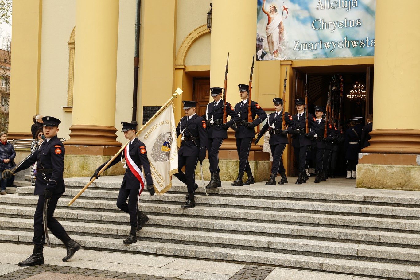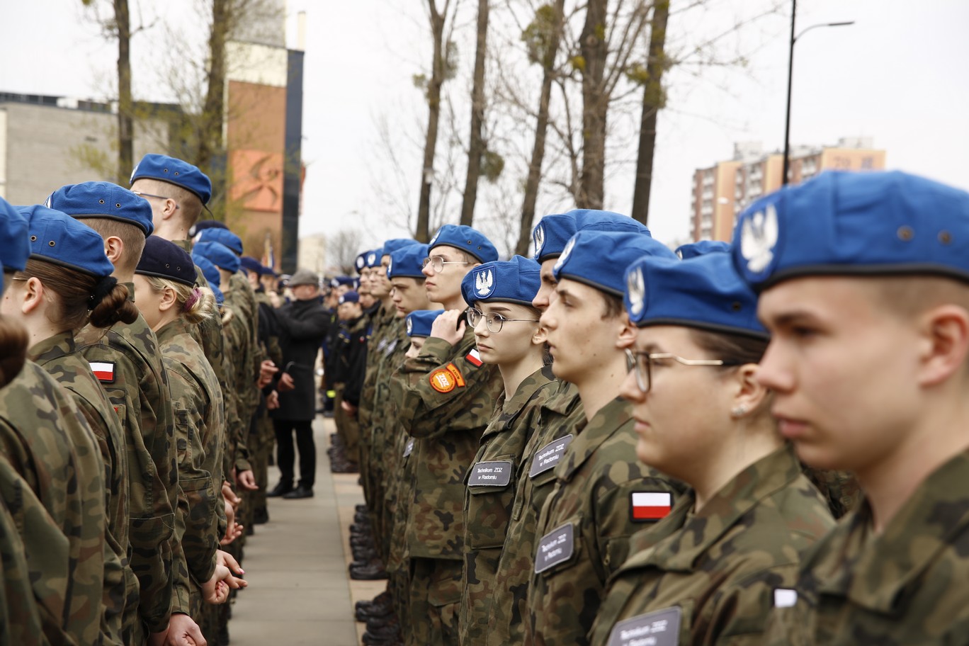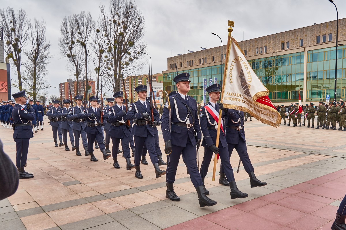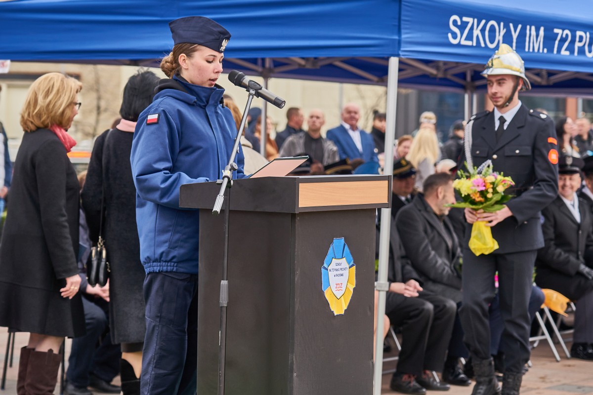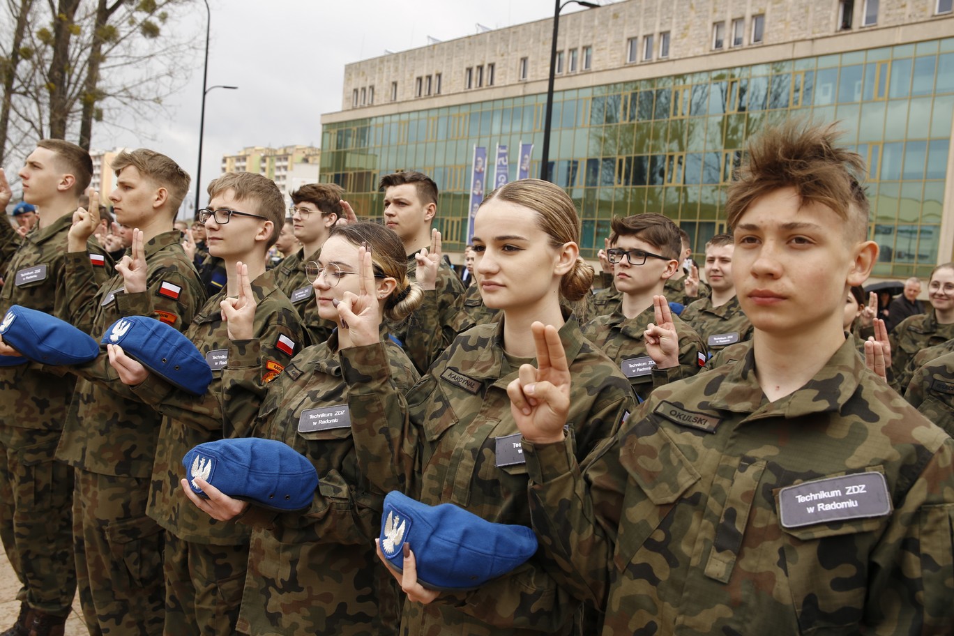 200 uczniów klas pierwszych Szkół im. 72 Pułku Piechoty w Radomiu Zakładu Doskonalenia Zawodowego złożyło ślubowanie zgodne z wojskowym ceremoniałem. Główna uroczystość odbyła się 19 kwietnia 2023 r. na Placu. Jagiellońskim. Ceremoniał poprzedziła msza święta w Kościele Garnizonowym, sprawowana w intencji społeczności szkolnej. Wśród gości uroczystości byli przedstawiciele władz państwowych, oświatowych oraz samorządowych, także służby mundurowe, partnerzy szkoły w realizacji edukacji wojskowej, policyjnej i strażackiej. - To już 14 rok, kiedy kultywujemy tradycję ślubowania uczniów klas pierwszych. Ta uroczystość z każdym rokiem coraz bardziej zachwyca. Jestem dumna, że tylu młodych ludzi pragnie zdobywać nowe kwalifikacji, jednocześnie rozwijając w sobie etos patriotyzmu i poświęcenia dla ojczyzny. Obecność klas mundurowych w naszej szkole nie jest przypadkowa. Placówka nosi imię 72 pułku piechoty, tak blisko związanego z historią Radomia - mówiła dyrektor Katarzyna Kołodziejska. Wyboru szkoły pogratulował uczniom Wojciech Skurkiewicz, wiceminister obrony narodowej, życząc tego, aby w przyszłości zostali żołnierzami Wojska Polskiego. Jak podkreśliła Katarzyna Kalinowska, zastępca prezydenta Radomia, Szkoły ZDZ z blisko 30 kierunkami kształcenia są ważnym punktem na edukacyjnej mapie Radomia. - Życzę składającym ślubowanie uczniom, by po zakończeniu edukacji mieli ogromną satysfakcję i poczucie dobrze podjętej decyzji – powiedziała wiceprezydent. Młodzieży udzielił błogosławieństwa ks. mjr Łukasz Józef Hubacz, proboszcz Kościoła Garnizonowego. Za wyjątkowo wzruszającą uroczystość podziękowali dyrekcji i gronu pedagogicznemu szkoły rodzice. Uczniowie zaś nie kryli radości, zgodnie stwierdzając, że ten dzień zapamiętają na długo. Od pierwszych dni nauki w szkole czują się pełnoprawnymi członkami społeczności szkolnej. Teraz pełnym sercem będą realizować słowa wypowiedzianej przysięgi. Ślubowanie było też okazją, aby wyróżnić listami gratulacyjnymi pierwszoklasistów, którzy zaangażowali się w przygotowanie uroczystości. Jak co roku, uczestnicy i obserwatorzy tej uroczystości nagrodzili gromkimi brawami pokazy umiejętności uczniów klas fryzjerskich oraz naszej kompanii reprezentacyjnej. Blisko dwugodzinny ceremoniał zakończyła efektowna defilada kompanii reprezentacyjnych zaprzyjaźnionych szkół m.in. z Kielc, Ostrowca Świętokrzyskiego, Nowego Miasta n. Pilicą i Sokołowa Podlaskiego. Radomianie zaś mogli poczęstować się prawdziwą żołnierską grochówką.