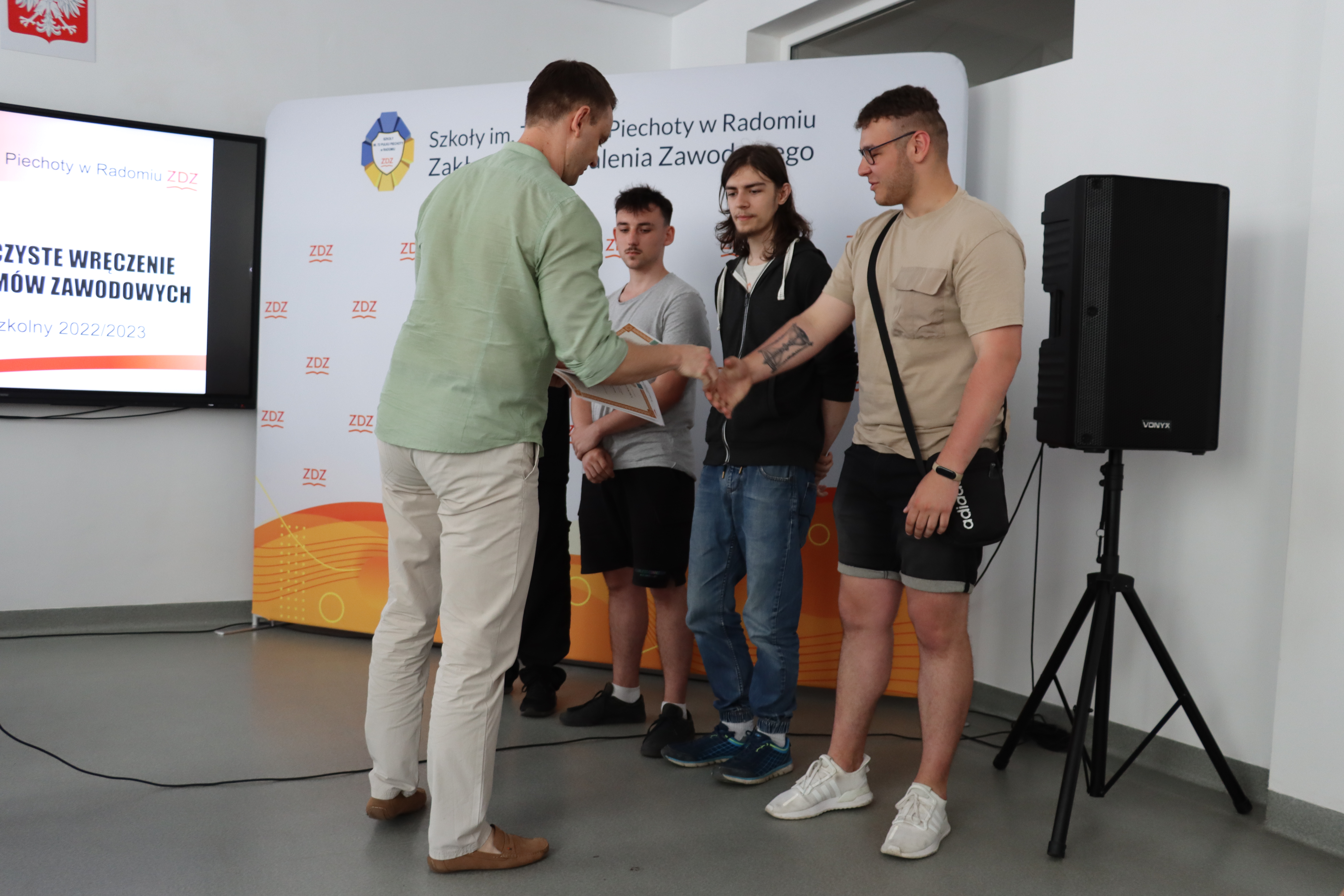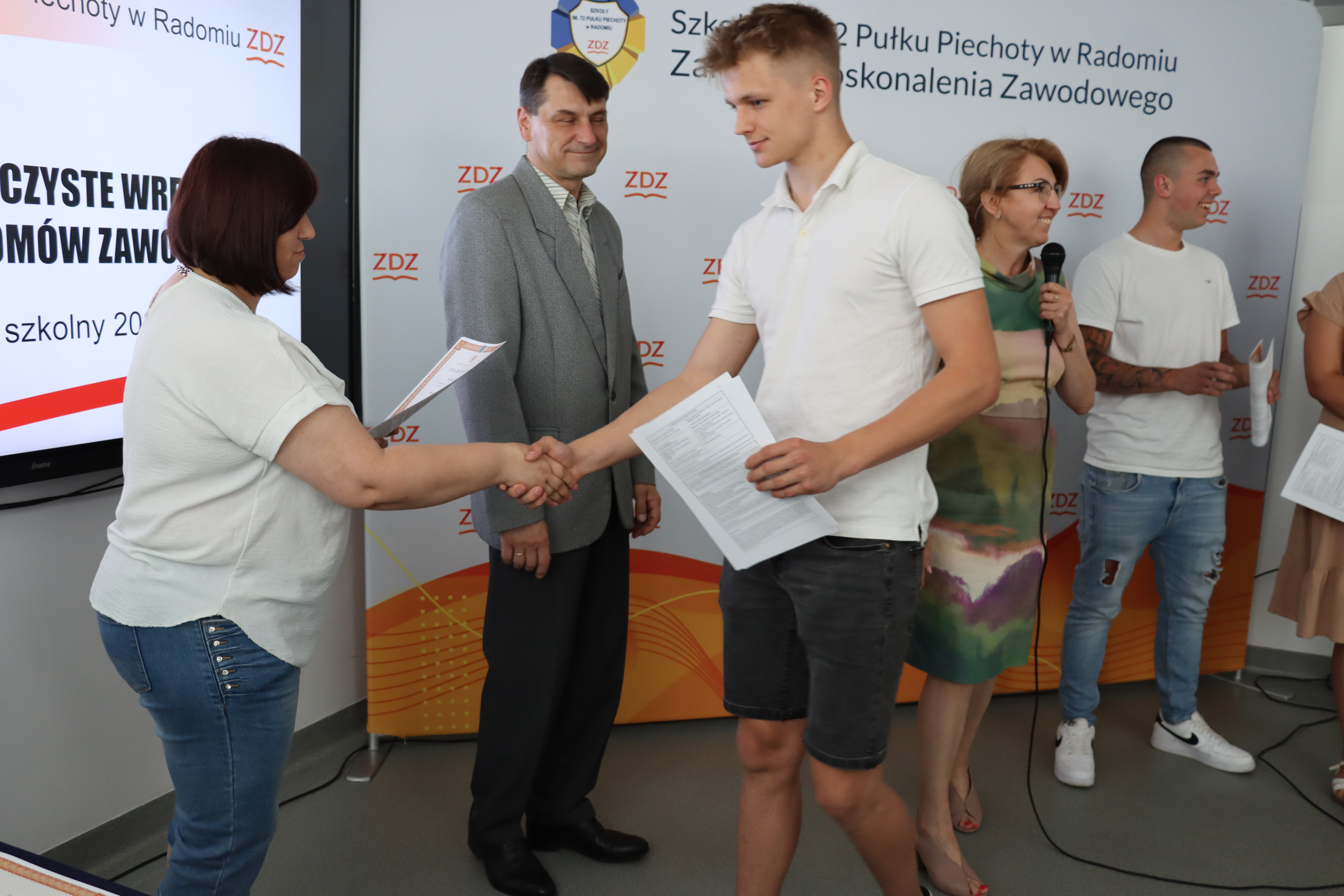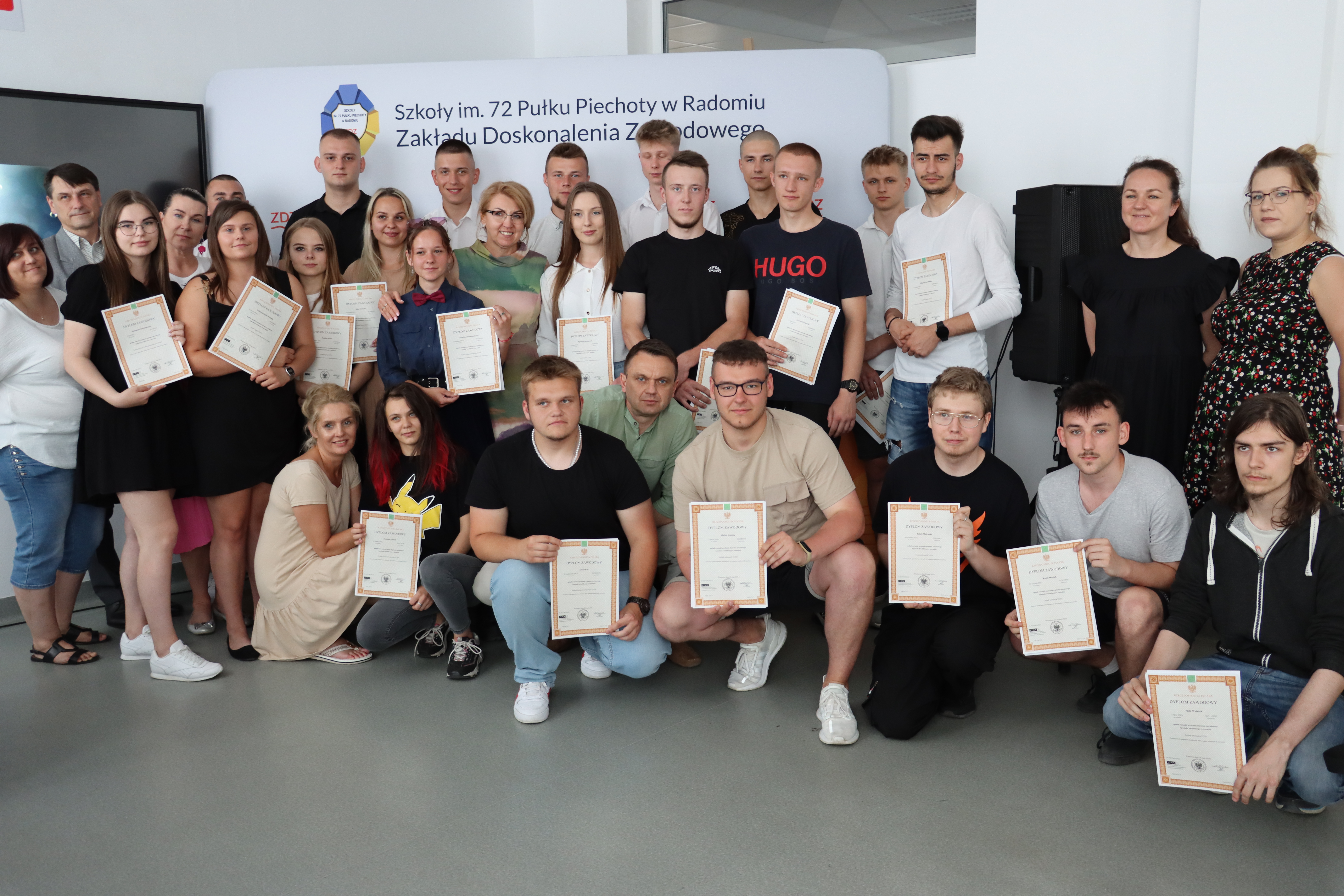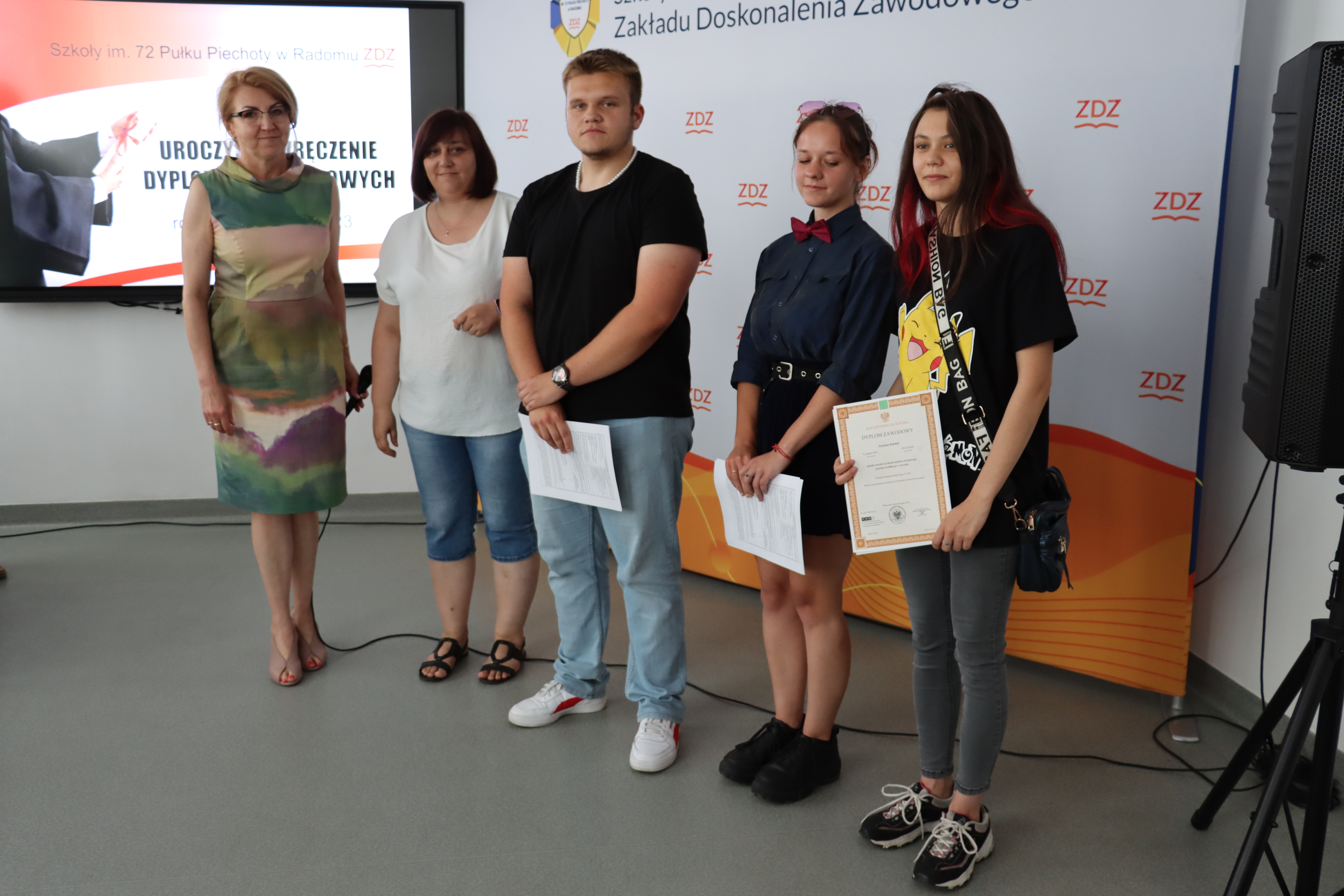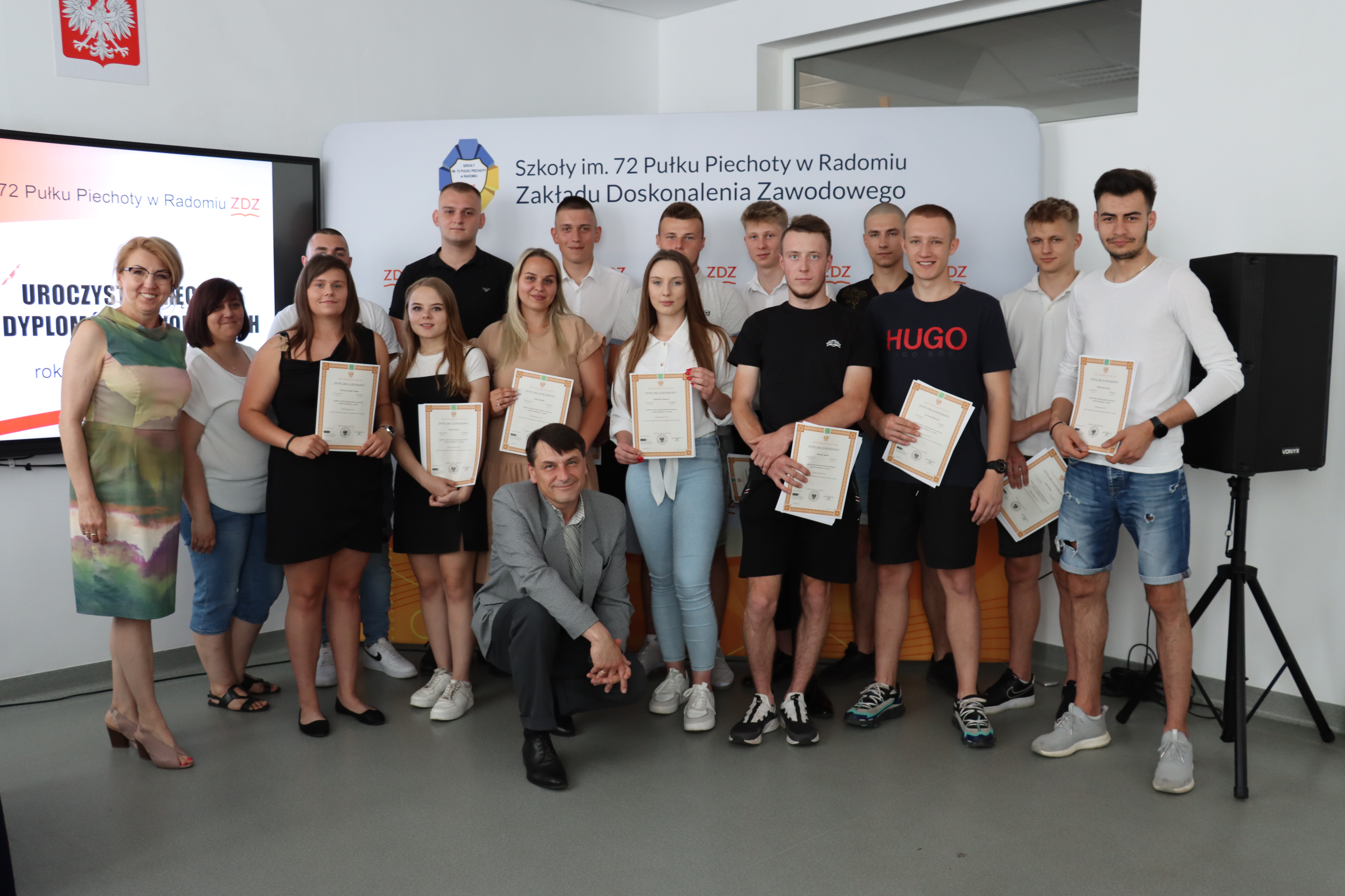 20 czerwca 2023 r. w bardzo uroczystej oprawie absolwenci Technikum odebrali dyplomy zawodowe. – To pierwszy tak ważny dokument na ścieżce waszego kształcenia zawodowego. Następne będzie świadectwo maturalne, a na koniec – dyplom ukończenia studiów. Życzę, aby otrzymany dziś dyplom pomógł Wam odnaleźć się w dorosłym życiu zawodowym, albo na rynku pracy albo przy wyborze uczelni – zwróciła się do zgromadzonej młodzieży dyrektor szkoły Katarzyna Kołodziejska. Wśród tegorocznych absolwentów są uczniowie, którzy poprzez wcześniejszą naukę w gimnazjum Zakładu Doskonalenia Zawodowego związani byli ze Szkołami im. 72 Pułku Piechoty przez 7 lat. Wybierając technikum, mieli tutaj możliwość nauki w zawodach, które przygotowują kadry dla kluczowych obszarów gospodarki narodowej, jak również dla służb mundurowych. Warto wymienić takie kierunki, jak: technik transportu kolejowego, technik logistyk, technik informatyk, technik hotelarstwa, technik żywienia i usług gastronomicznych, technik usług fryzjerskich. Zarówno wyboru kierunku kształcenia, jak i uzyskanego dyplomu zawodowego pogratulowała absolwentom Pani Dyrektor, jednocześnie wyrażając uznanie dla nauczycieli przedmiotów zawodowych, którzy swoim zaangażowaniem i kreatywnością przyczyniają się do stałego podnoszenia jakości nauczania.