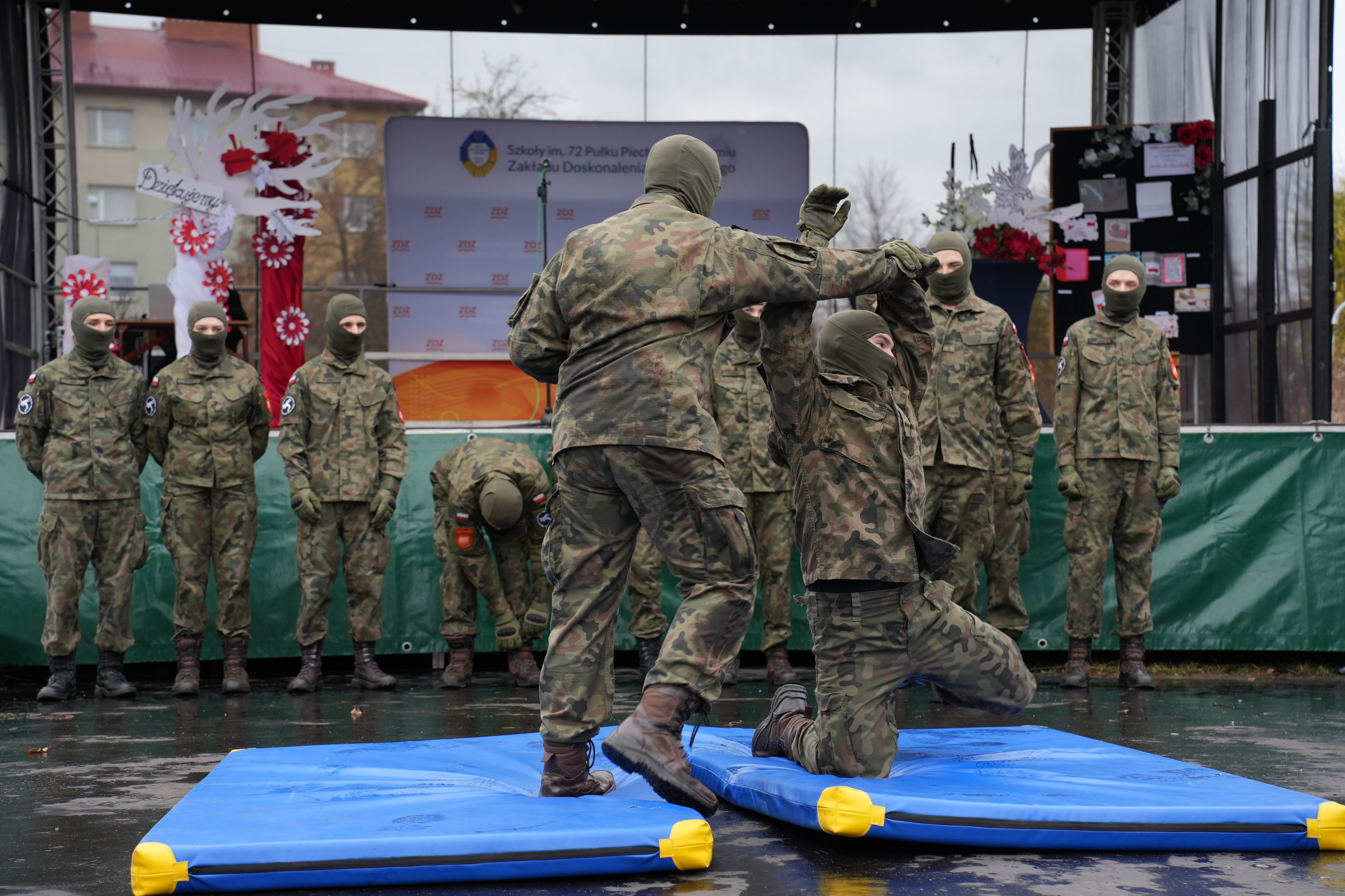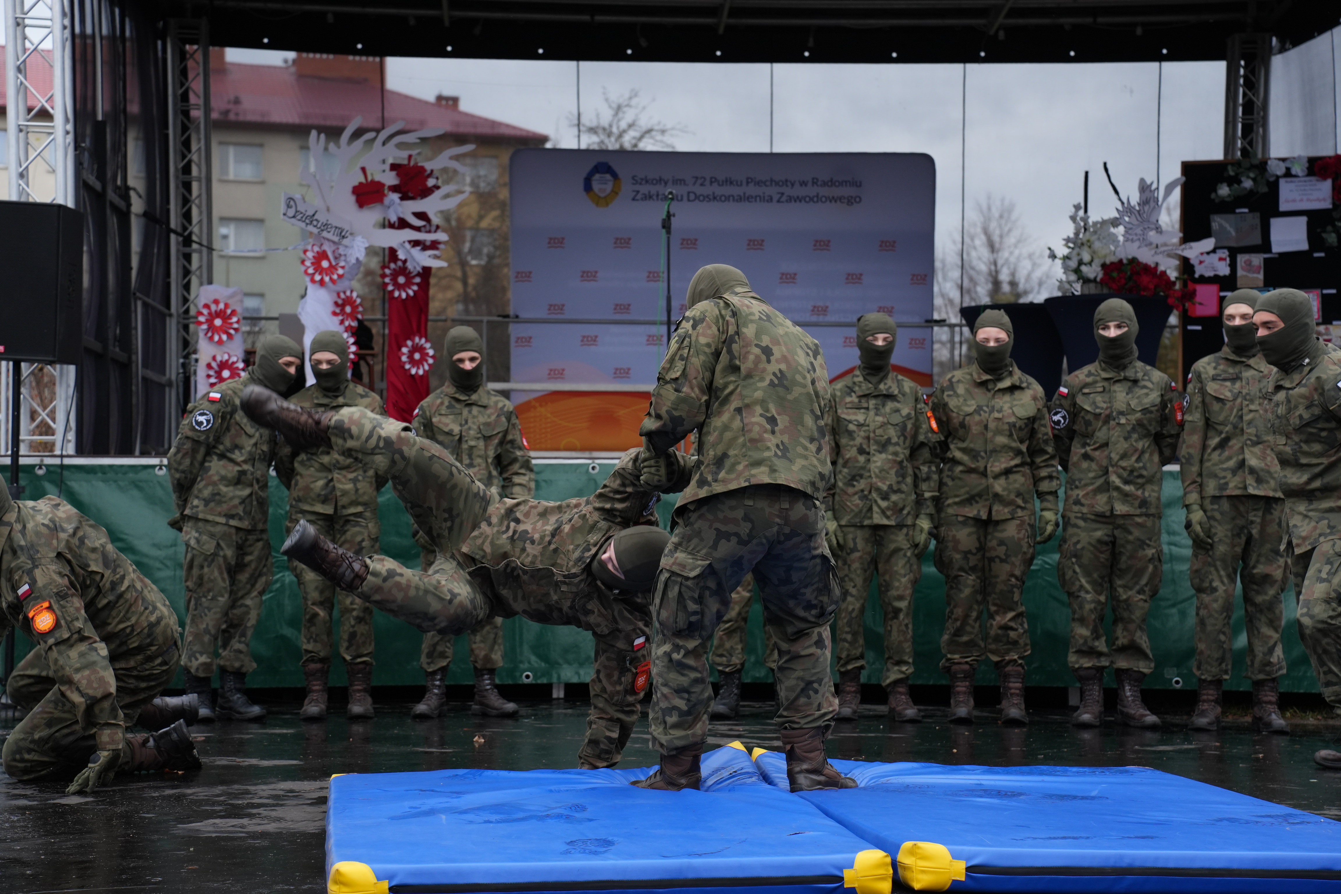21 listopada br. na Pl. Księdza Z. Domagały, Szkoły im. 72 Pułku Piechoty w Radomiu Zakładu Doskonalenia Zawodowego w partnerstwie z Ośrodkiem Szkolenia Zawodowego OHP zorganizowały Piknik Niepodległościowy. Okazją do przybliżenia tego nieco zapomnianego miejsca w radomskiej przestrzeni są plany jego rewitalizacji przez władze miasta. Plenerowe wydarzenie skierowane było do wszystkich mieszkańców Radomia ze szczególnym uwzględnieniem lokalnej społeczności dzielnic Kaptur i Zamłynie. Piknik otworzyła brawurowo Orkiestra Reprezentacyjna WOT pod kierunkiem st. chor. sztab. Tomasza Chwalińskiego, następnie odbyły się pokazy umiejętności uczniów, występy, konkursy. Dwa z nich – na okolicznościową pracę plastyczną „Kartka dla Niepodległej” oraz „Bieg dla Niepodległej” zostały uroczyście rozstrzygnięte, a ich laureaci nagrodzeni. Swoje stoiska z działaniami o charakterze profilaktycznym oraz gadżetami wystawiły służby mundurowe: Komendy Wojewódzka i Miejska Policji, Wojskowe Centrum Rekrutacji, 6 Mazowieckiej Brygady Obrony Terytorialnej oraz Ośrodek Reprezentacyjny WOT. Nie zabrakło poczęstunku prawdziwą żołnierską grochówką. Piknik poprowadzony przez red. Magdalenę Gliszczyńską, zaszczycili swoją obecnością znamienici goście, wśród nich wicewojewoda Patryk Fajdek, komendant mazowiecki OHP w Warszawie Liliana Kozielska, zastępca Komendanta Miejskiego Policji w Radomiu mł. insp. Grzegorz Michorek, dowódca 62. Batalionu Lekkiej Piechoty WOT ppłk Artur Wasilewski, a także mieszkańcy dzielnicy Kaptur na czele z ks. dr Rafałem Grzywaczem z Parafii Matki Bożej Częstochowskiej. Nie przeszkodził chłód i lekki śnieg, było biało-czerwono i radośnie.