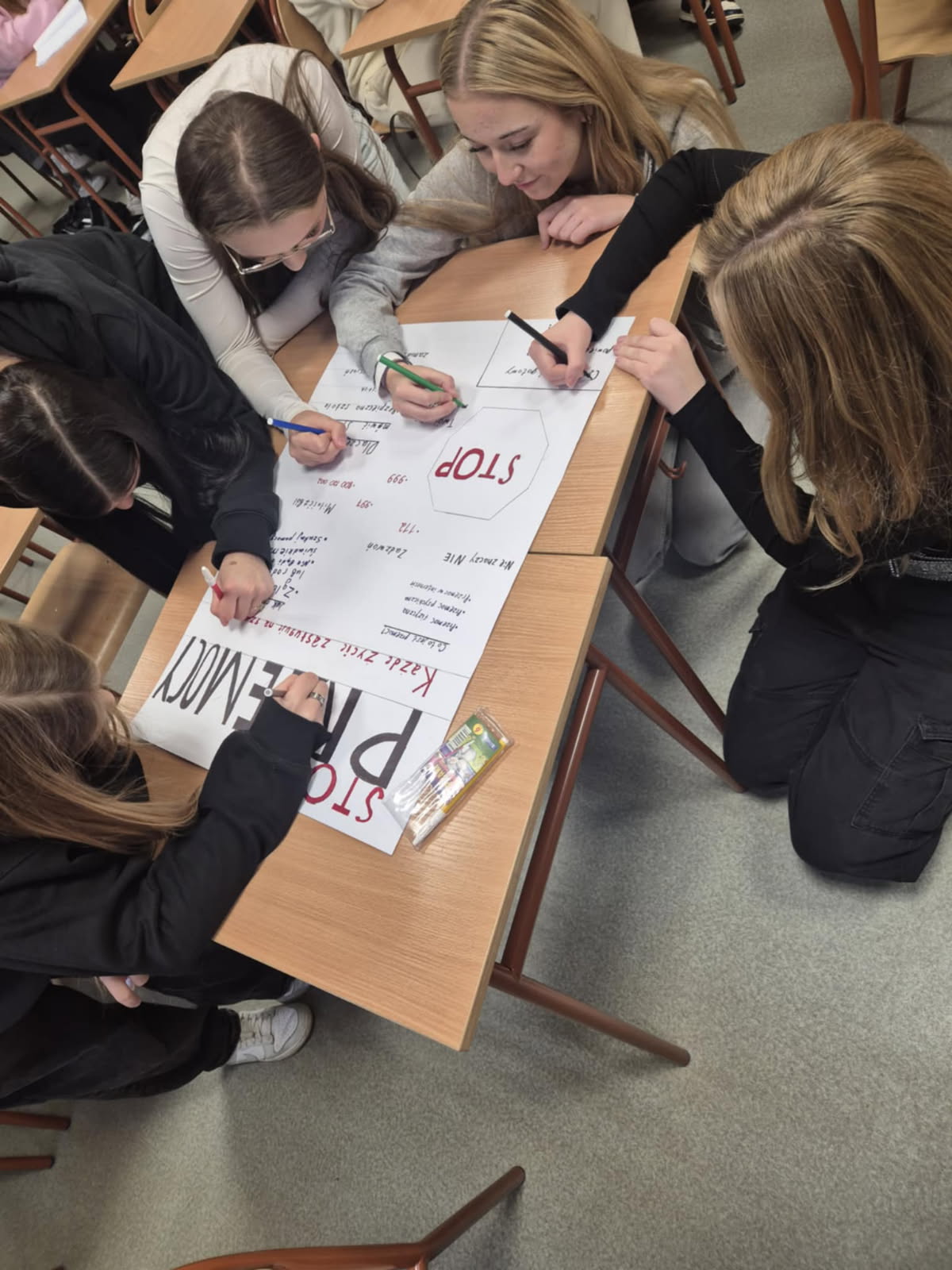 - Warsztaty i zajęcia wychowawcze – w wybranych klasach przeprowadzono godzinę wychowawczą poświęconą tematowi „Jak reagować na przemoc i wspierać rówieśników?”. Uczniowie pracowali w grupach, analizowali przykłady sytuacji konfliktowych i wspólnie opracowywali sposoby reagowania.