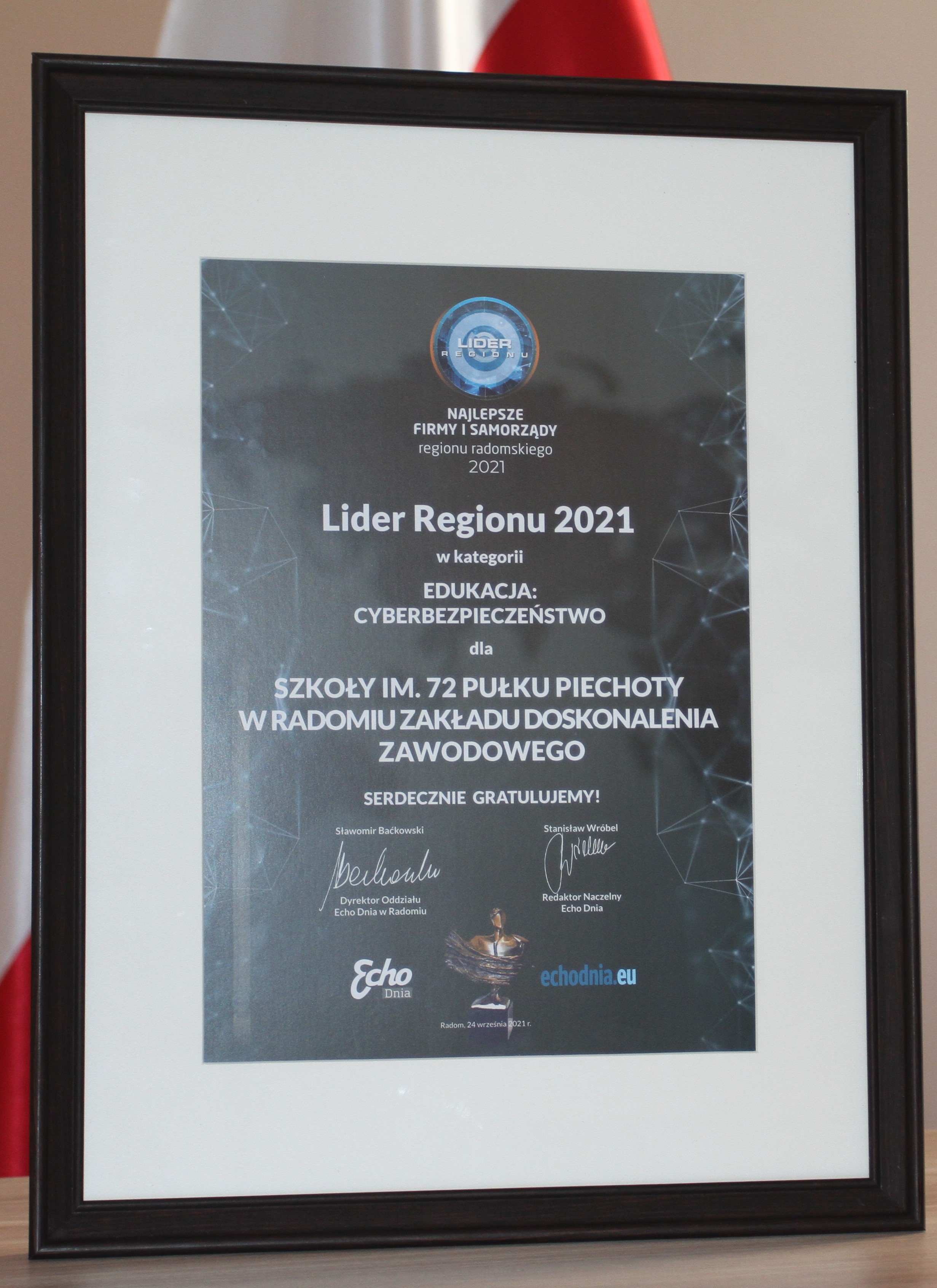 Prestiżowa statuetka popularnego dziennika „Echo dnia” tym razem trafiła do Szkół im. 72 Pułku w Radomiu Zakładu Doskonalenia Zawodowego w kategorii CYBERBEZPIECZEŃSTWO.