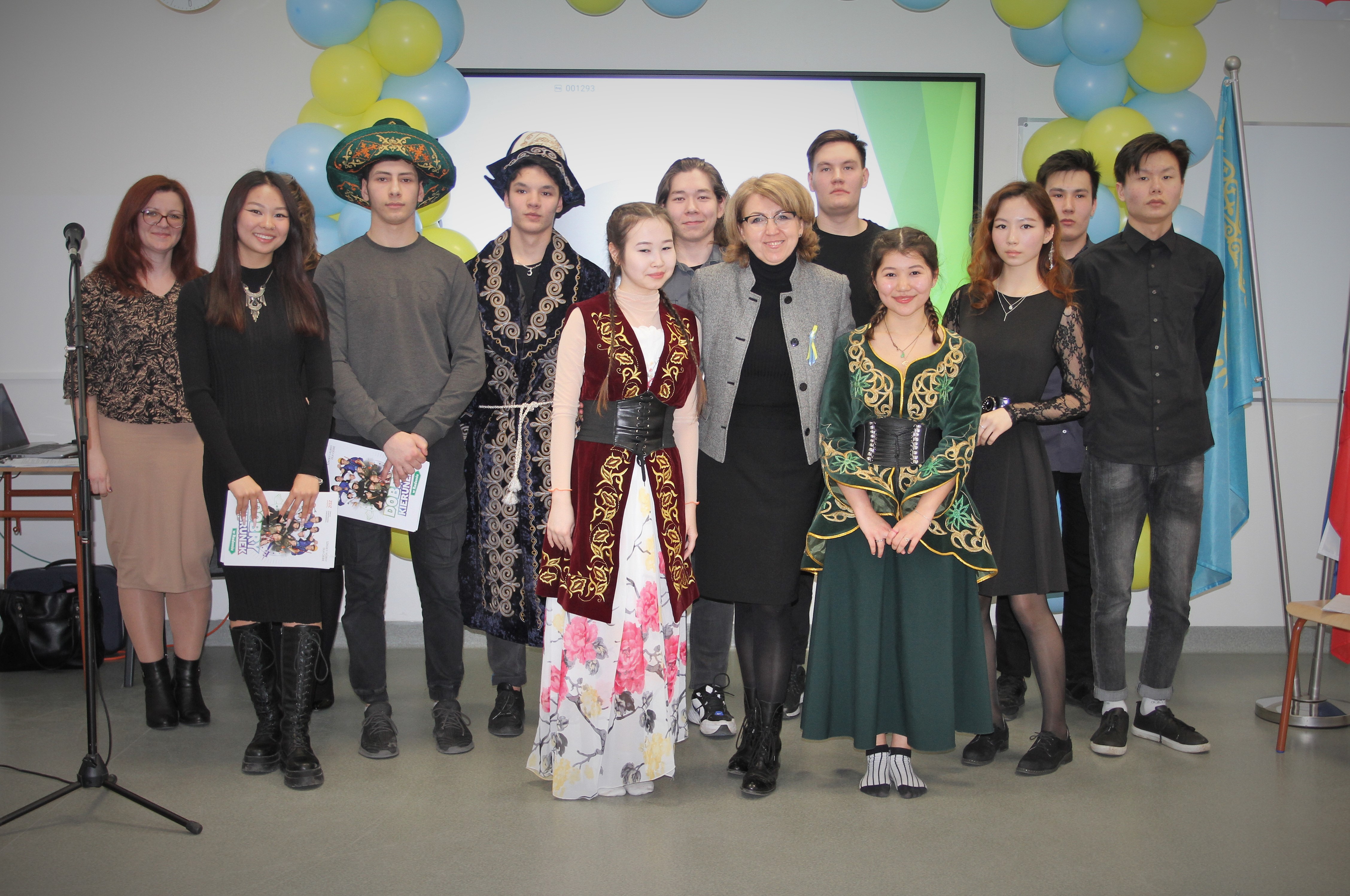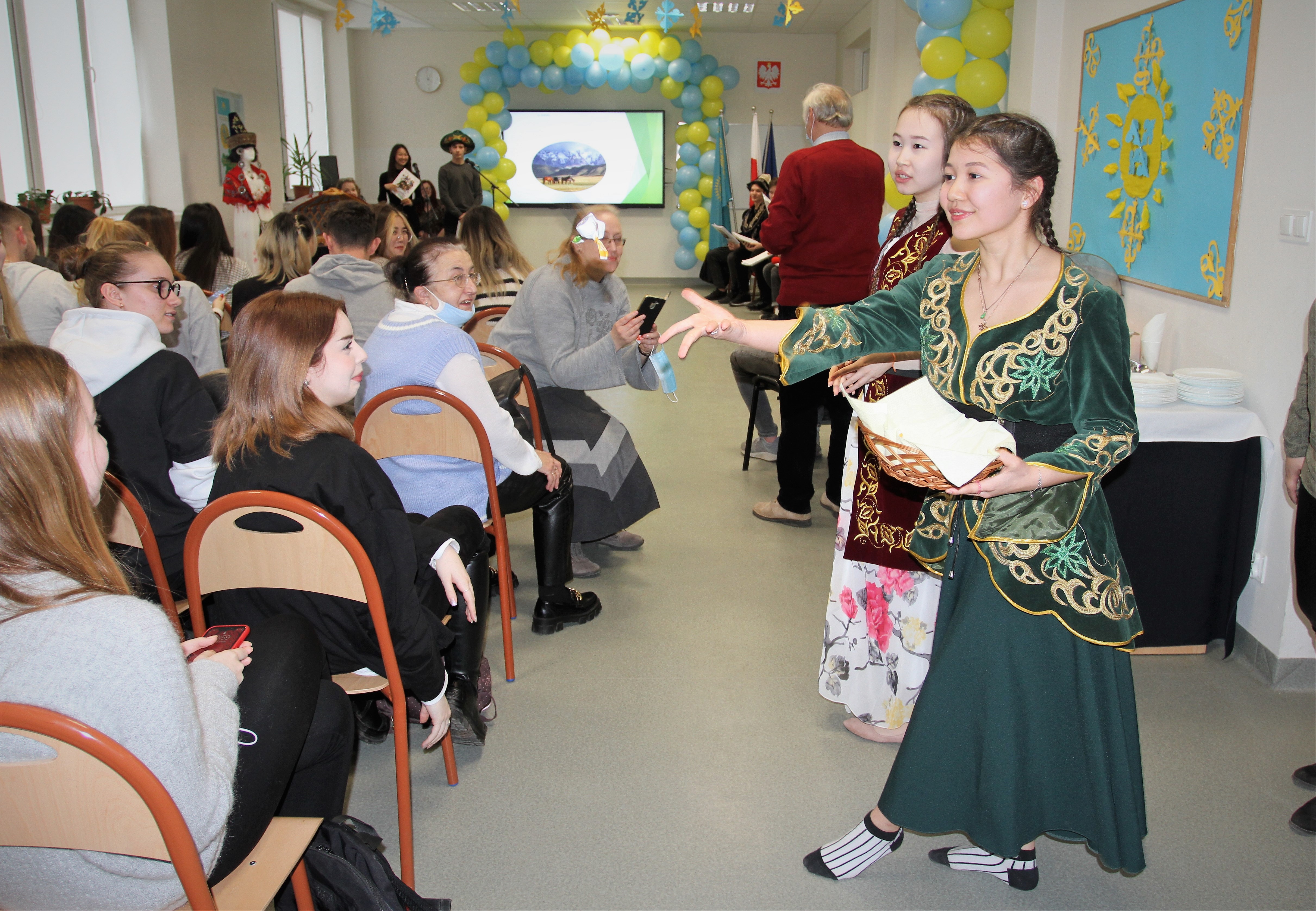 Po prawdziwej uczcie duchowej przyszła pora na „coś” dla podniebienia. Wśród degustowanych smakołyków kuchni kazachskiej znalazły się m. in. manty, czyli tradycyjne pierożki, danie pod nazwą plow, „pięć palców” i bursaki przypominające nasze racuszki. Na zakończenie dyrektor szkoły Katarzyna Kołodziejska pogratulowała pomysłu Dnia Kultury Kazachstanu, ale i talentu młodzieży, wyrażając radość, że możemy cieszyć się wolnością, czuć się bezpiecznie i żyć w kraju, gdzie można poznawać inne narody współczesnego świata. Pani Dyrektor podziękowała też za przybycie na to wydarzenie grupie studentek z Kazachstanu, aktualnie uczących się w Akademii Finansów i Biznesu „Vistula” w Warszawie. Wszyscy, w geście solidarności z uczniami szkoły, którzy pochodzą z Ukrainy, minutą ciszy uczcili pamięć ofiar konfliktu rosyjsko-ukraińskiego.